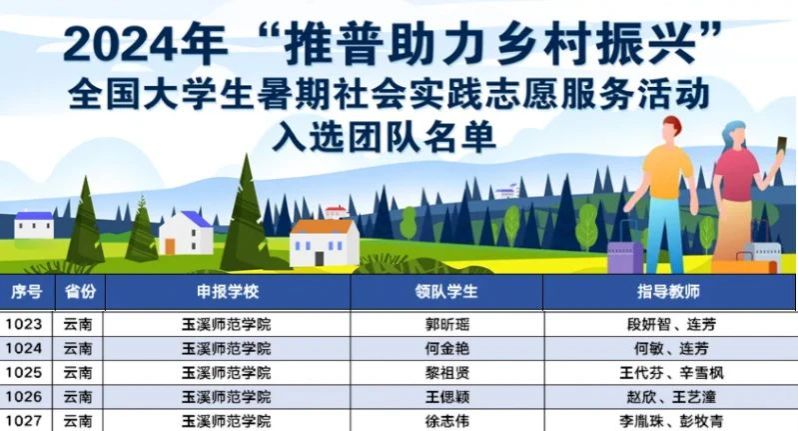 近日,经教育部语言文字应用管理司、共青团中央青年发展部委托相关国家语言文字推广基地组织专家审议,北京大学等1200支团队入选2024年“推普助力乡村振兴”全国大学生暑期社会实践志愿服务团队,我校来自马克思主义学院、文学院、教师教育学院、商学院的5支团队成功入选,入选数量居云南省高校第二。