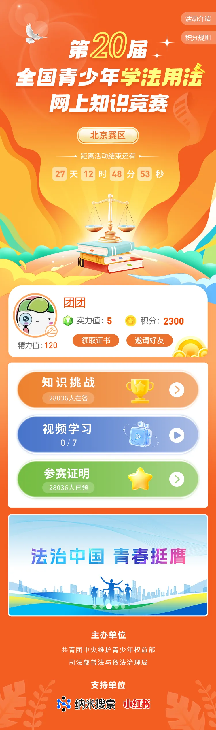 为全面贯彻党的二十大和二十届二中、三中全会精神,贯彻落实习近平法治思想和习近平总书记关于青年工作的重要思想,引导广大青少年做社会主义法治的忠实崇尚者、自觉遵守者、坚定捍卫者,2024年12月4日起,由共青团中央维护青少年权益部、司法部普法与依法治理局联合主办的第二十届全国青少年学法用法网上知识竞赛正式启动!