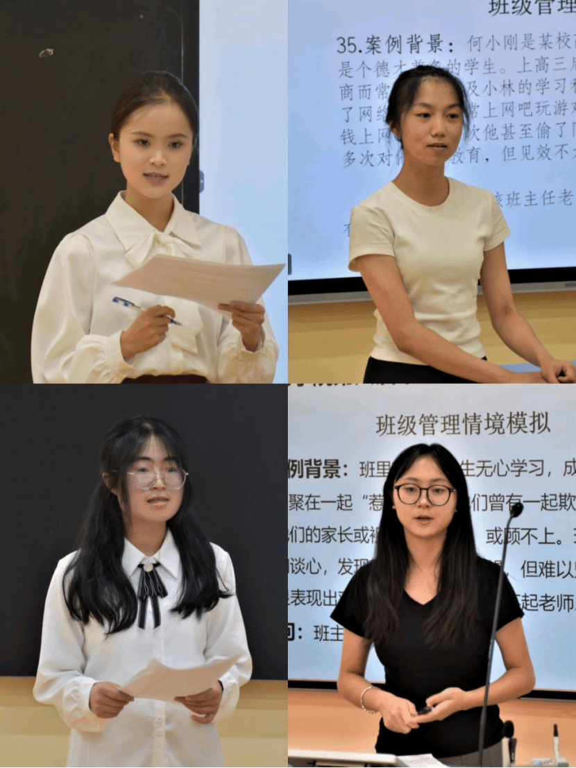 参赛题目由参赛选手随机抽取,选手就试题进行充分思考,分点叙述解决班级管理问题的思路并进行“无生”情景模拟展示。这一环节中,各参赛选手结合班级管理情景,条理清晰地表达自己的见解,沉着冷静的态度以及自信大方的仪态展现出了良好的语言表达能力和逻辑思维能力。