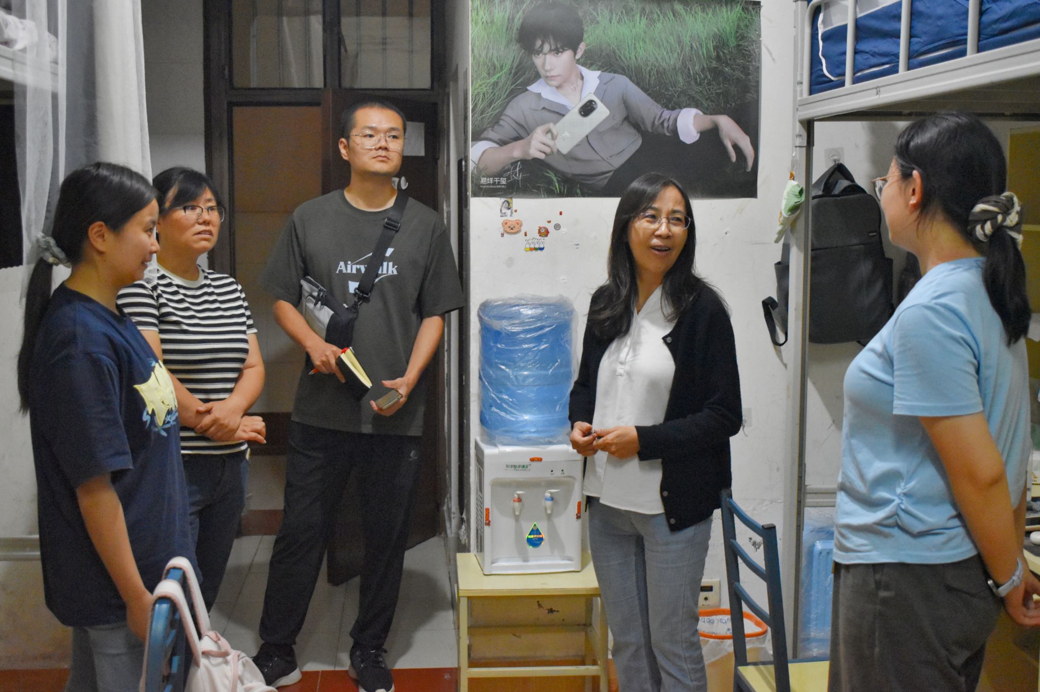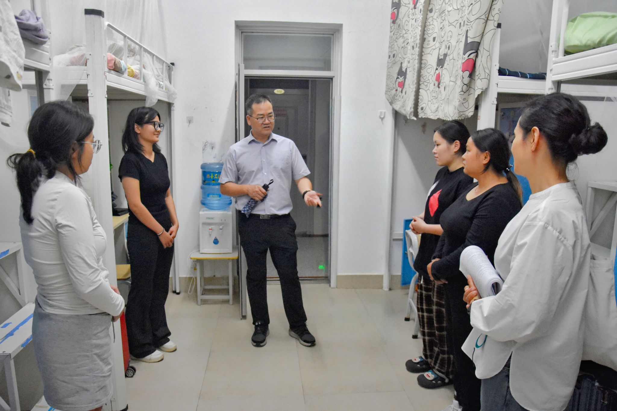 为深入了解2025届新生住宿情况与入学状态,解决新生实际需求,商学院党委书记姜芹春、院长叶宏、副院长马小宁、赵洋与辅导员、新生班主任于2025年8月26日20:00一同走进学生宿舍,开展暖心走访活动。