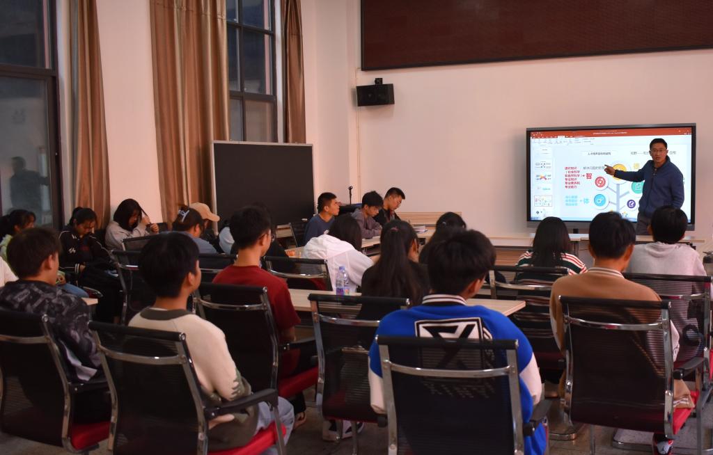 罗辉书记以“关于幸福?你感受到幸福是什么?你认为的幸福是什么?”三个问题引出此次活动的主题,让同学们带着问题进一步思考如何在幸福的基础上进行大学生涯规划。罗辉书记从幸福经济学的角度,利用“幸福公式”讲述预期与基础条件的匹配性,指出同学们要以自身实际情况为主制定合理的目标,通过德、智、体、美、劳全方面学习来完善自己的目标并明确目标实现的途径,同时要持续保持努力与幸福目标的动态优化,维持长期性、实质性的幸福感,并用“三牛精神”鼓励同学们为创造幸福美好生活锐意进取、不断创新、艰苦奋斗。