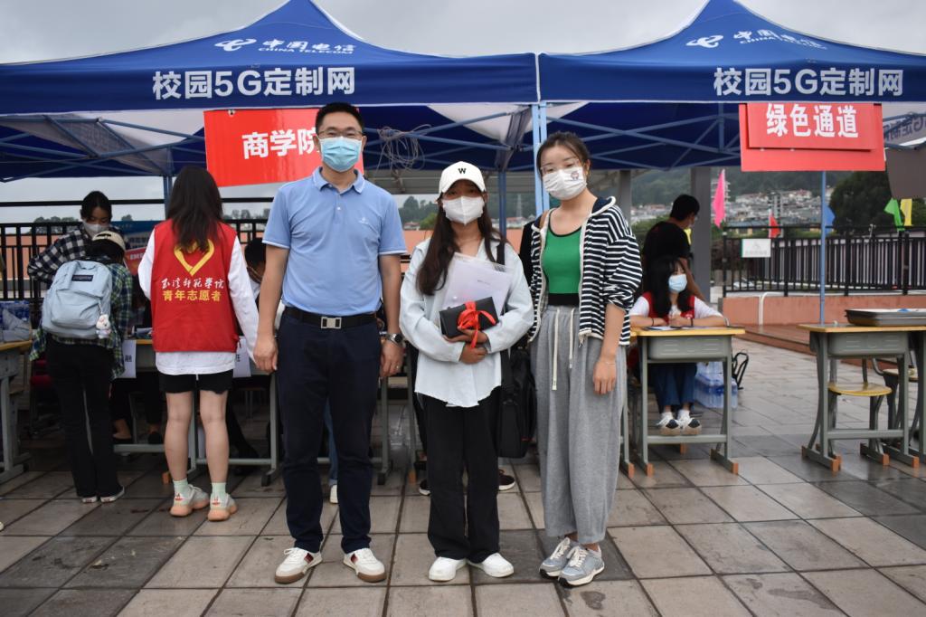 早上9时,商学院迎来了第一位报到的同学,学院党政领导及学长学姐对新生学子表示热烈欢迎,并为其赠送玩偶和钢笔作为纪念品,寓意着学院对新生在今后的成长路上有朋友作伴、尽情书写新的梦想的美好祝福,拿到纪念品的同学喜笑颜开,对学院的关切表示感谢。罗辉书记和班主任马艳琼老师还与其进行合影留念,定格这一美好瞬间。