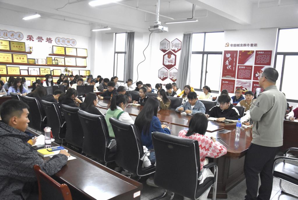 为激励学生干部加强自身修养,提高自身素质,2022年10月14日17:00,商学院党委副书记姜芹春在实训大楼A栋601会议室为商学院学生干部上思政课。