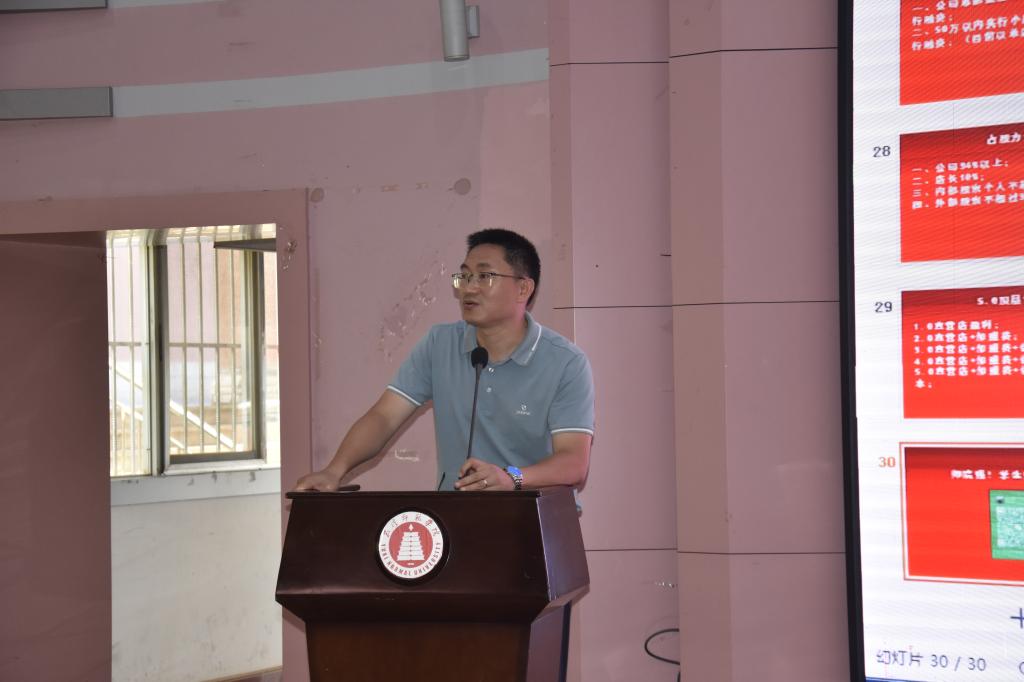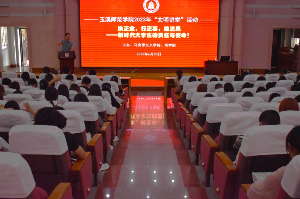 为了推进社会主义核心价值体系建设,大力弘扬社会正气,发挥道德模范的示范引领作用,2023年6月25日16:00玉溪师范学院商学院联合马克思主义学院开展了“文明讲堂”活动。此次活动由马克思主义学院党委书记罗辉老师主持,2023年云南省“五一劳动奖章”获得者,商学院2008届毕业生李通升学长主讲,商学院2022级同学参与此次活动。