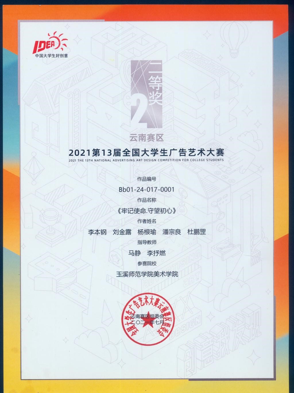 2021第13届全国大学生广告艺术大赛云南省级赛本届大赛,参赛作品分为10个类别(A平面类,Ba视频类影视广告,Bb视频类微电影广告,Bc视频类短视频,C动画类,D互动类,E广播类,F策划案类,Ga文案类广告语,Gb文案类长文案)以及10个大赛命题。在学校各级领导及教务处的高度重视和大力支持下,美术学院、文学院各指导教师带领学生进行了认真的作品创作和报送工作。经过学校初评、赛区评选,我校报送了13件作品,有1件作品参加云南省级决赛,获得二等奖1项的佳绩。