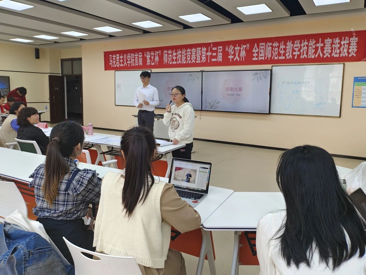 为加强马克思主义学院学生教学能力基本功训练,提升教学技能,为第十三届“华文杯”全国师范生教学技能大赛做好人才选拔和优秀成果储备,马克思主义学院于2024年3月24日早8点在12教103室举办了马克思主义学院首届“紫艺杯”师范生技能竞赛暨第十三届“华文杯”全国师范生教学技能大赛选拔赛(决赛)。本次竞赛由马克思主义学院副院长杨少英、玉溪师院附中政治教师仝丽婷、玉溪市骨干教师张艳担任评审。