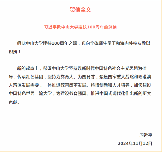中共中央总书记、国家主席、中央军委主席习近平11月12日致信祝贺中山大学建校100周年,向全体师生员工和海内外校友致以祝贺。