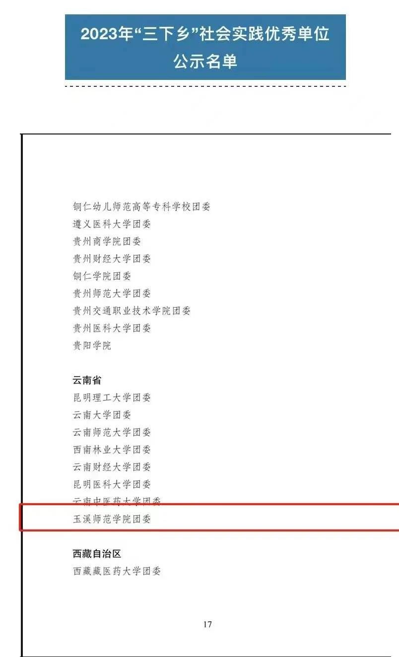 近日,共青团中央公布《2023年全国大中专学生志愿者暑期文化科技卫生“三下乡”社会实践活动总结通报结果》,作为唯一地州高校团委,学校团委获评2023年“三下乡”社会实践优秀单位。这是我校继今年获得2023年云南省大中专学生暑期“三下乡”社会实践活动优秀单位后,在社会实践工作方面取得的又一殊荣。