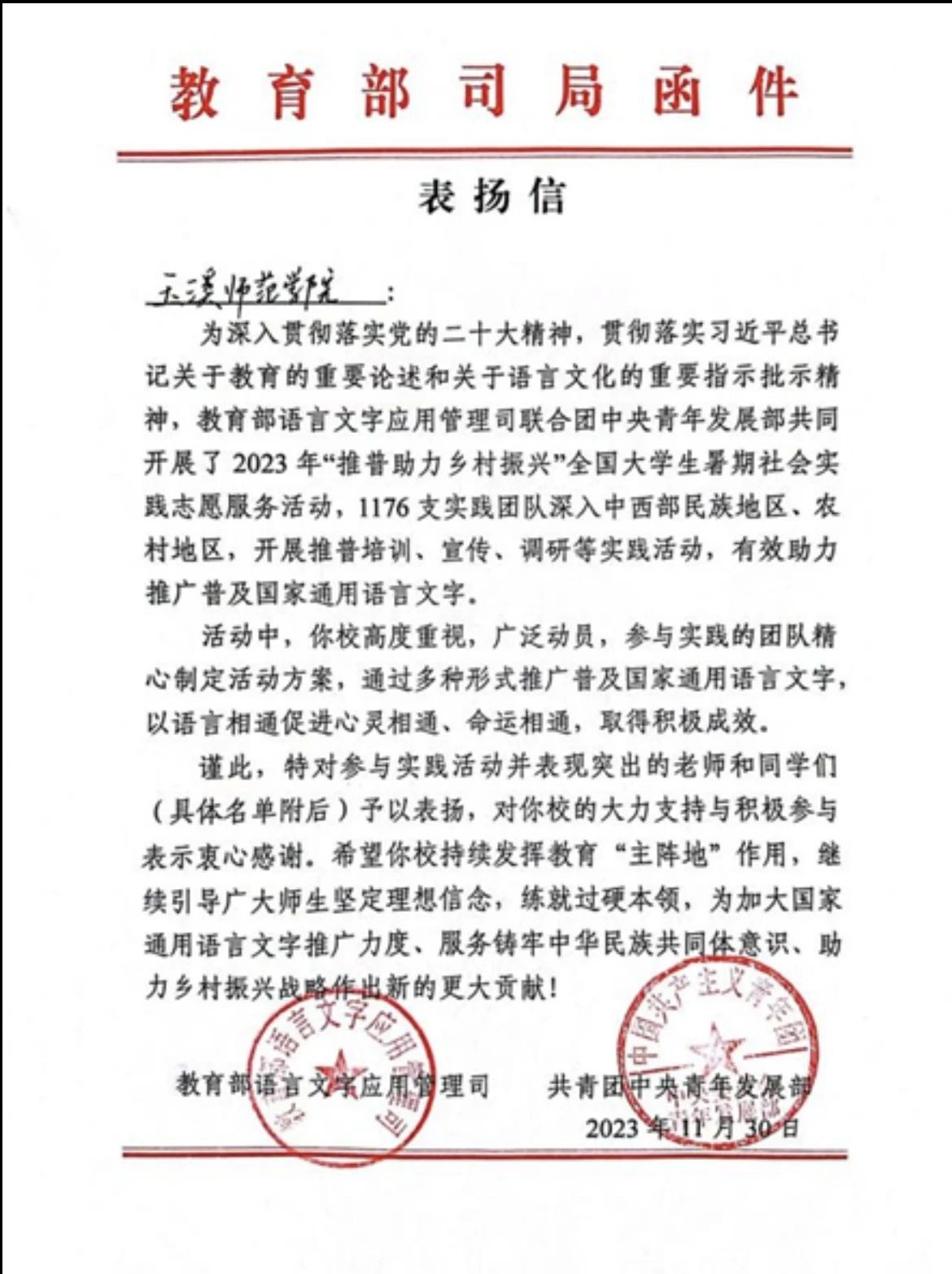 表扬信中对玉溪师范学院文学院“四只耳朵”青年推普团赴元江甘庄的工作成果给予肯定,希望我校持续发挥教育“主阵地”作用,继续引导广大师生坚定理想信念,练就过硬本领,为加大国家通用语言文字推广力度、服务铸牢中华民族共同体意识、助力乡村振兴战略作出新的更大贡献。