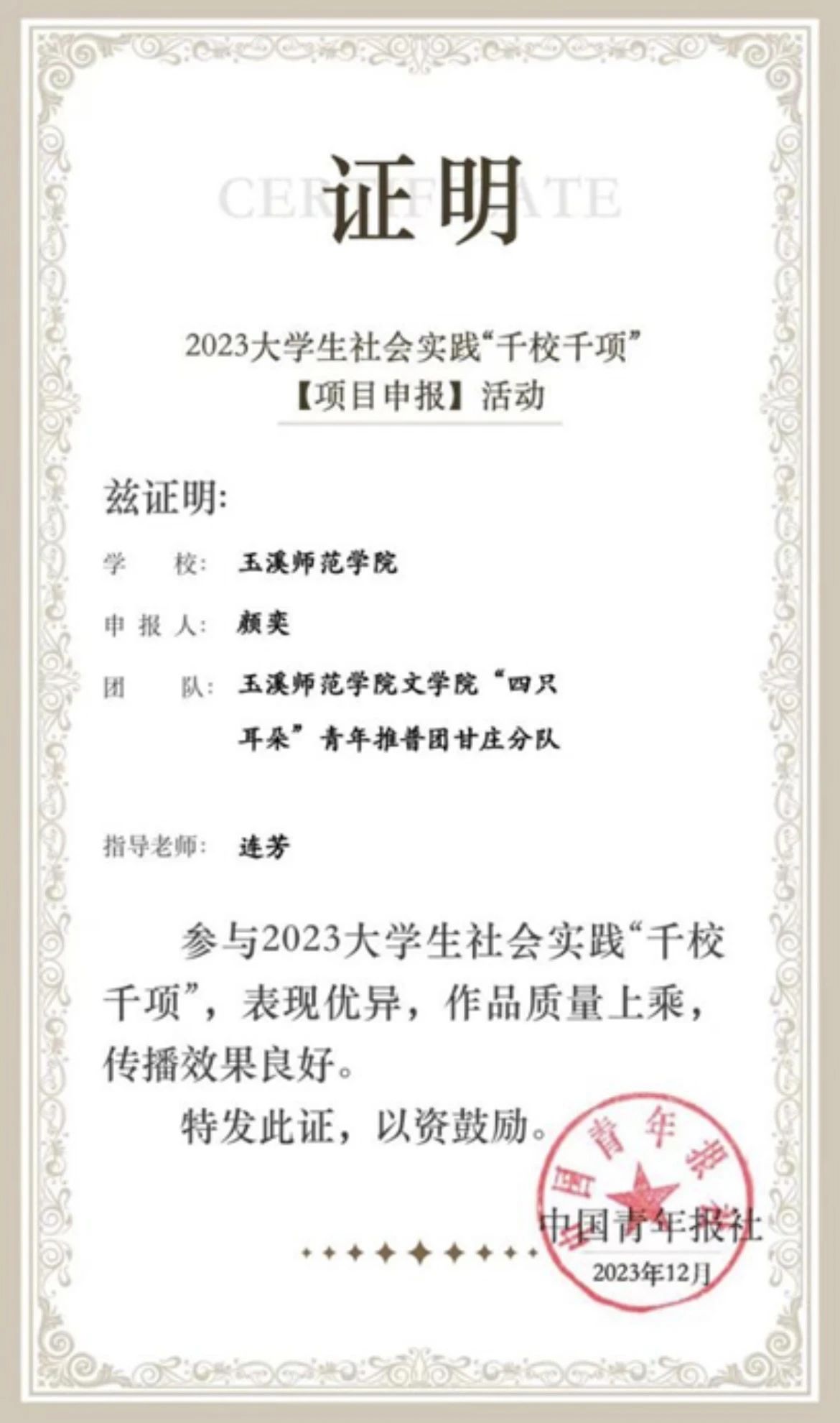 玉溪师范学院“四只耳朵”青年推普团由文学院团委书记连芳老师指导,谭兆迈、符筱颖、施宇、吴颖、胡仕敏、马玉萌、陈以珍、陶然、王强、朱诗静、李元满、颜奕、李志娴13位成员组成。实践团于2023年7月17日至23日深入玉溪市元江哈尼族彝族傣族自治县甘庄街道进行调研,开展“八个一”推普小课堂和面向少数民族母亲的“妈妈普通话”线上培训课程,以“果园推普”“直播助农”“实地调研”等多元形式将普通话带进田间地头,在实践地创设学习、练习普通话的语言环境,以青年人的干劲与热情为甘庄普通话推广工作贡献青春力量。