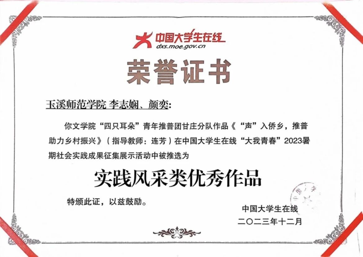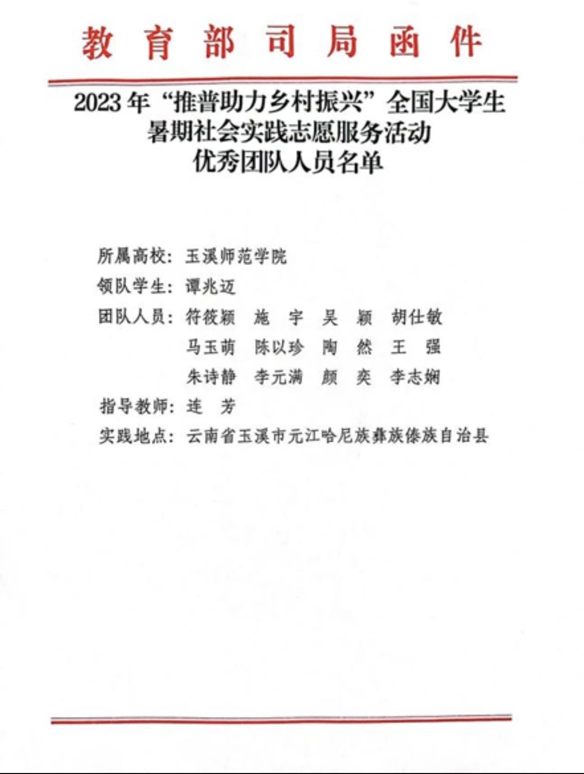 玉溪师范学院文学院赴玉溪市元江哈尼族彝族傣族自治县甘庄街道“四只耳朵”青年推普团在2023年“推普助力乡村振兴”全国大学生暑期志愿服务活动中表现出色,成果显著,喜获教育部语言文字应用管理司和团中央青年发展部的来信表扬。