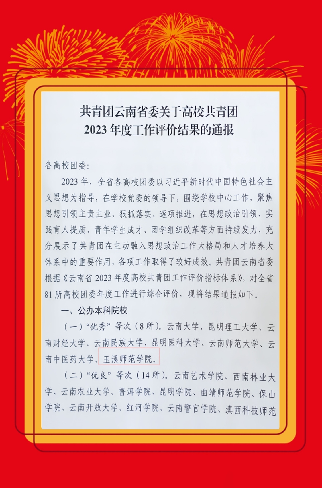 近日,共青团云南省委通报了全省高校共青团2023年度工作考核评价结果,玉溪师范学院共青团工作在全省24个公办本科院校中获评“优秀”等次,是获评“优秀”等次的唯一一家地州院校。