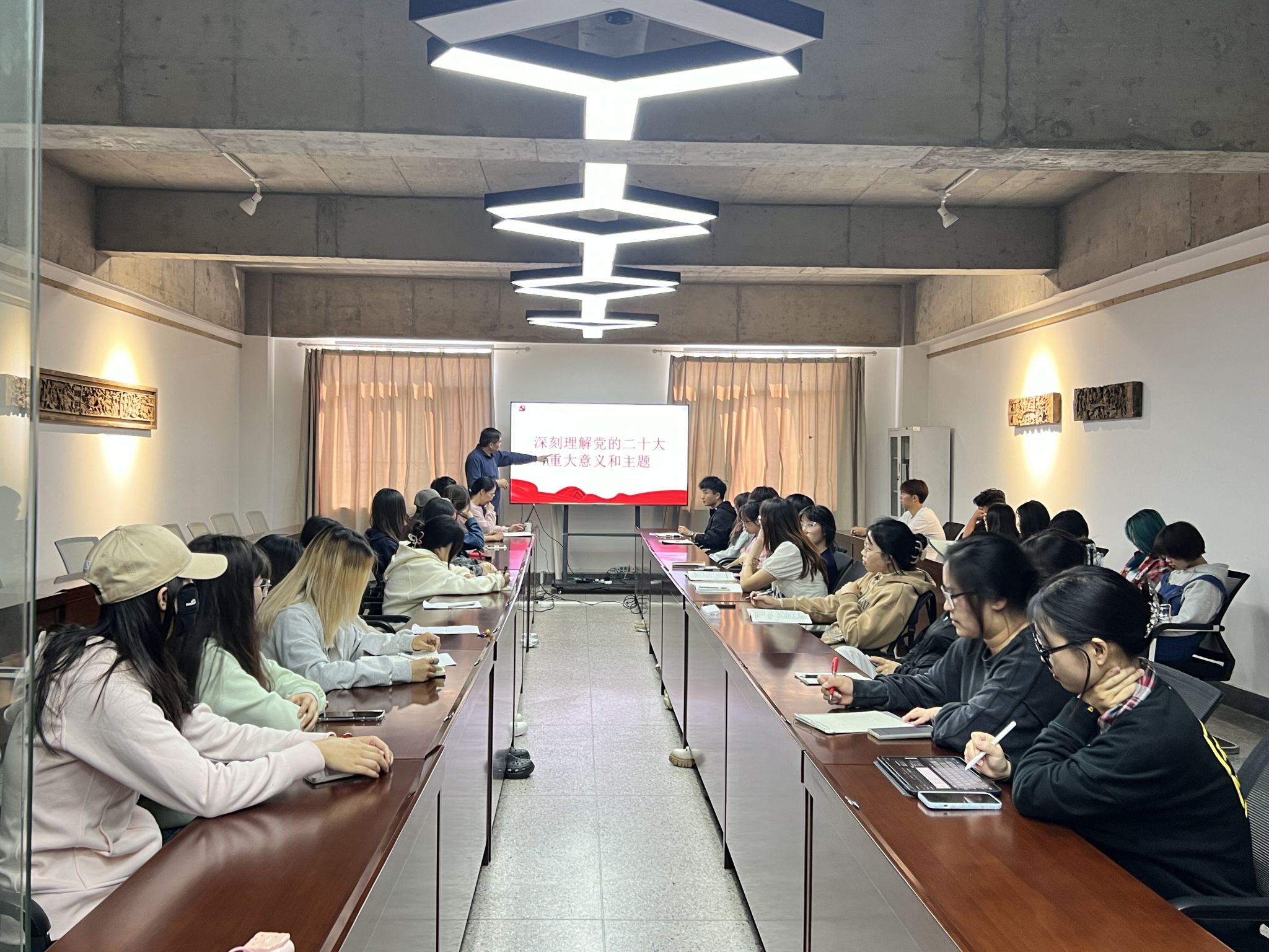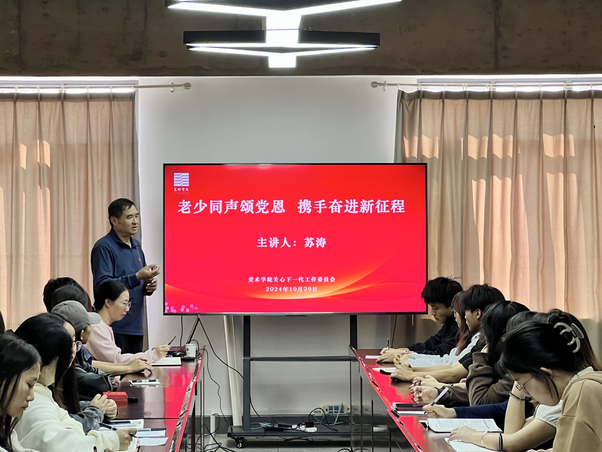 2024年10月30日,美术学院关工委组织开展党的二十大精神宣讲活动。美术学院学生党员、团学干部参加,美术学院关工委执行主任苏涛老师主讲,党委书记杨丽珍主持会议。