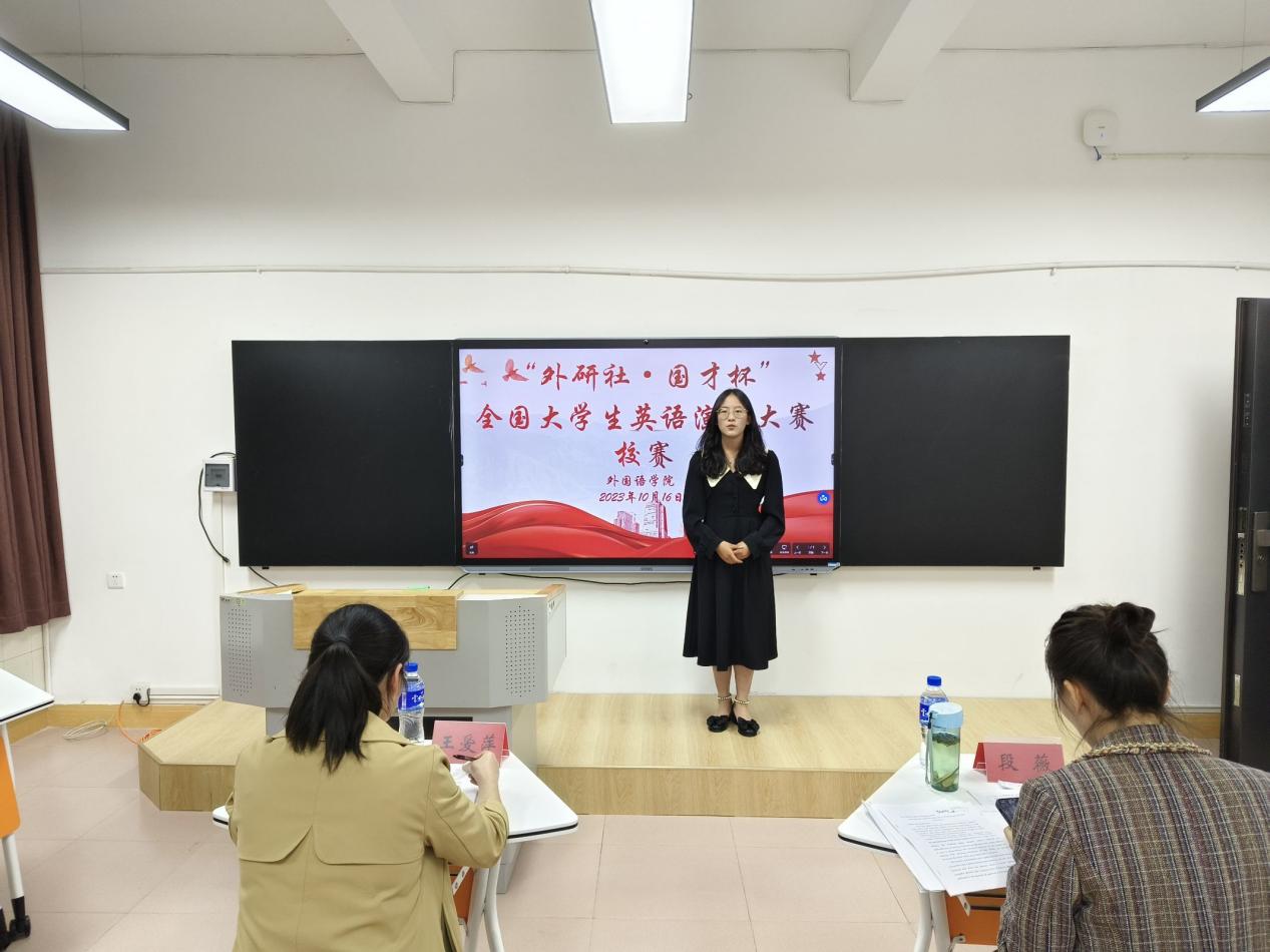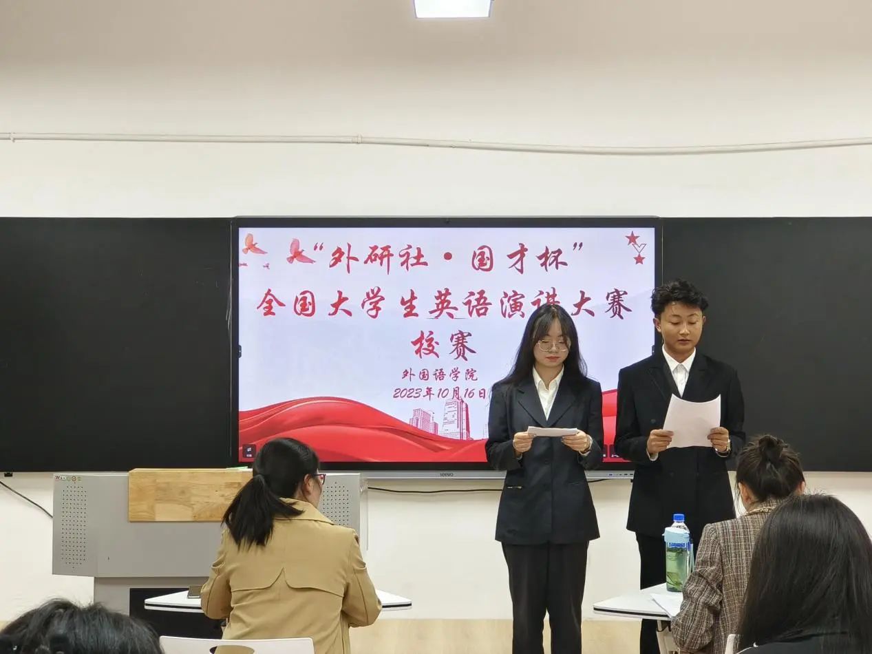 “外研社·国才杯”英语演讲比赛于2023年10月16日19:00在2教109和110教室举行。李德文、刘菊华、郑英波、莫晓艳、段薇、王爱萍六位老师作为此次比赛的评委老师。来自英语专业的专业选手和热爱英语的非专业选手,用流利的英语生动地讲述了对当代中国的独到见解和深深热爱。并展示了他们对于当代中国的深刻理解,选手们表现出了极高的英语水平和深厚的语言功底,给观众带来了一场视觉和思想的盛宴。评委老师表示“‘外研社•国才杯’‘理解当代中国’全国大学生外语能力大赛是一次非常成功的活动。它不仅提高了学生们的外语应用能力,更让他们深入了解了当代中国的变革和发展。希望通过这样的活动,培养更多具有国际视野和跨文化交流能力的新时代人才。”