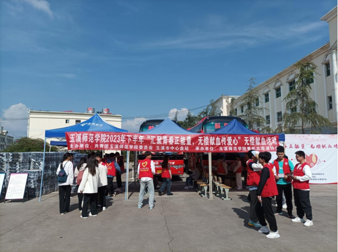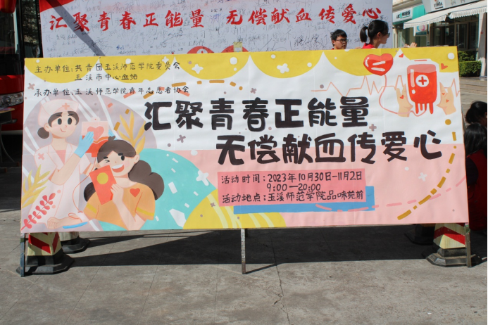 为深入学习宣传贯彻党的二十大精神,贯彻落实习近平总书记对深入开展学雷锋活动作出的重要指示,2023年10月30日-11月2日,由共青团玉溪师范学院委员会、玉溪市中心血站主办,玉溪师范学院青年志愿者协会承办的“汇聚青春正能量,无偿献血献爱心”无偿献血活动在学校品味苑门口开展。全校师生积极响应,踊跃参与,4天时间共895名师生参加献血,献血总量达254700毫升。