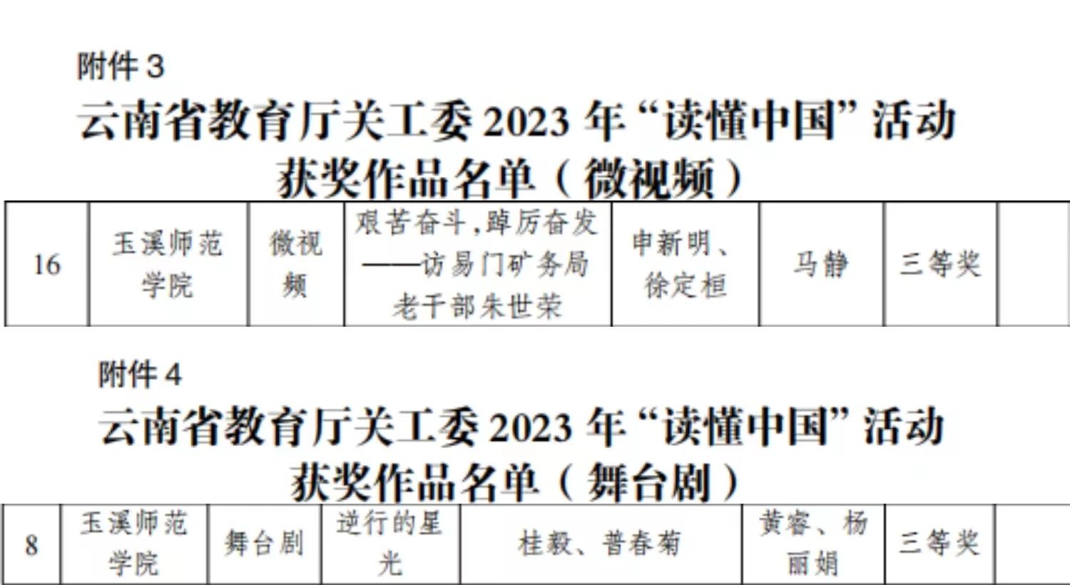 根据云南省教育厅关工委《云南省教育厅关心下一代工作委员会关于公布2023年读懂中国活动评审结果的通知》,我校荣获微视频作品三等奖1项,舞台剧作品三等奖1项。