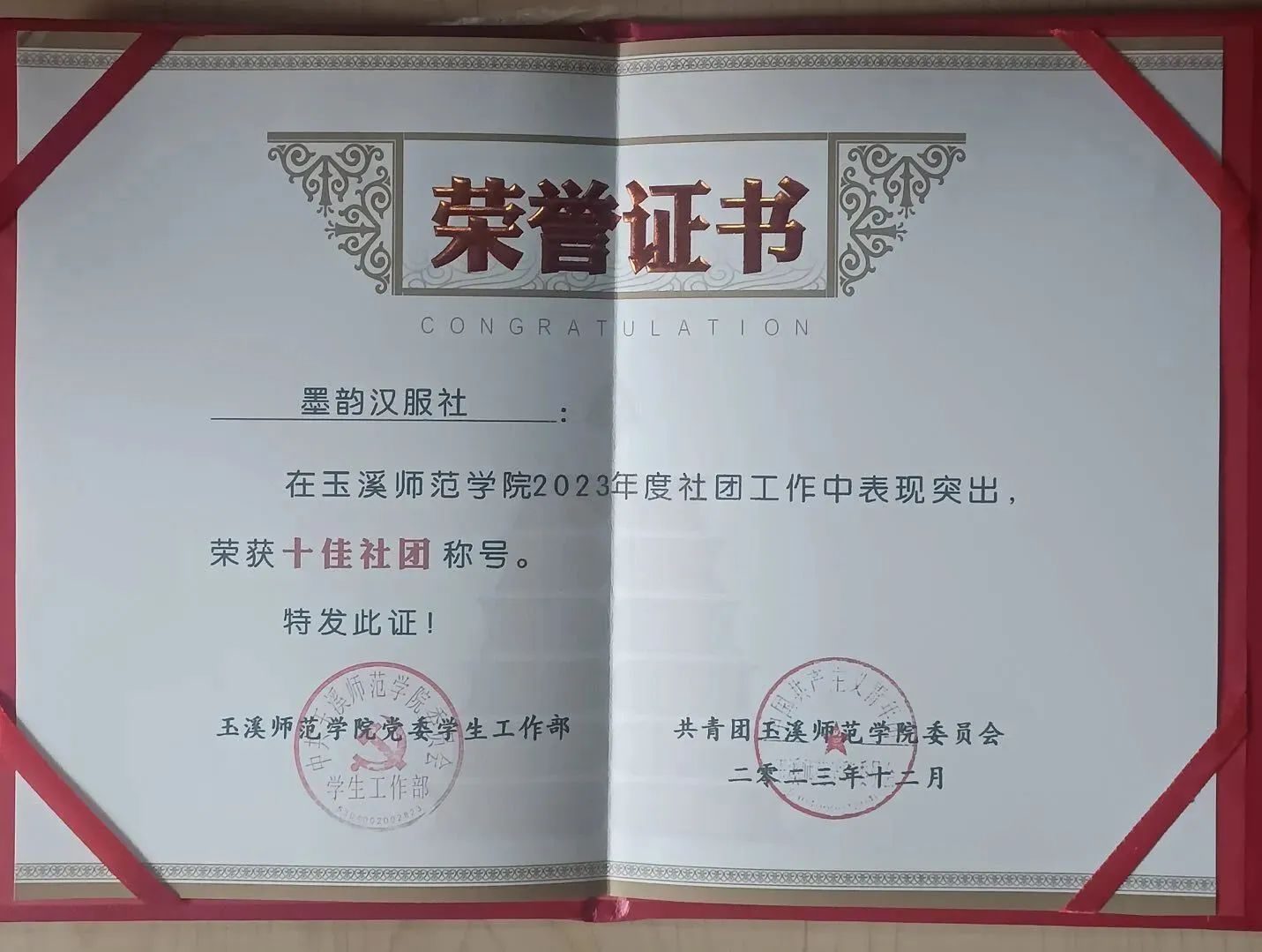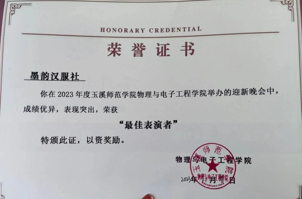 玉溪师范学院墨韵汉服社成立于2014年,社团秉承“始于衣冠,达于博远”的理念,致力于以汉服为载体传播中华传统文化。墨韵汉服社在学校各社团中率先实施活动“课程化”,打造“中华文化礼仪展演”“华服校园行”等品牌活动,吸引更多热爱传统文化、热爱汉服的同学加入汉服社的大家庭中,共同探讨传统文化的魅力。自2020年以来,连续4年获评玉溪师范学院优秀社团。墨韵汉服社基于社团“课程化”活动不断向社团成员和学校同学们宣传中华传统服饰、礼仪、节日等文化知识以实现传承和传播中优秀传统文化的理念。同时,墨韵汉服社下设置多个部门,各部本分工明确,各司其职,团结协作,组织成员开展花朝节、中秋节、端午节等一系列传统节日,带领成员以及同学们深入了解传统节日的相关文化知识,此外,社团自创舞蹈“风花雪月”在物理与电子工程学院2023年的迎新晚会中获得“最佳表演者”称号,体现了社团的创新力与展现力。