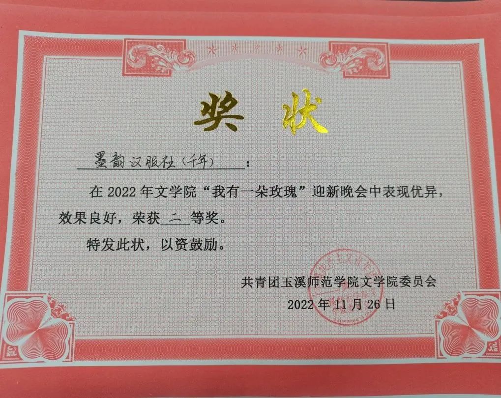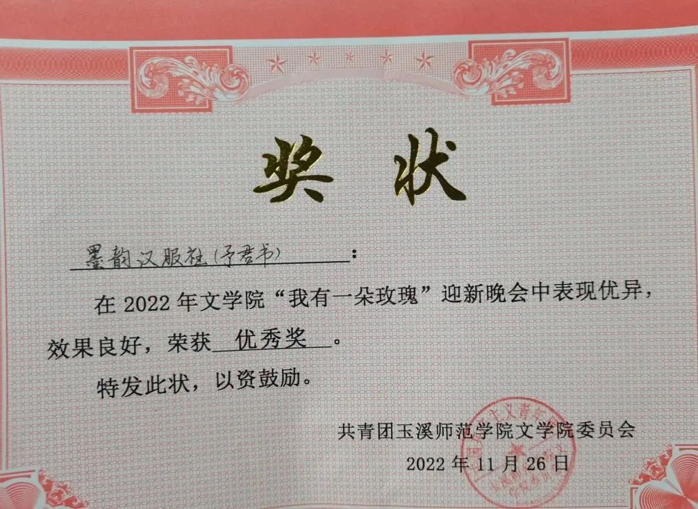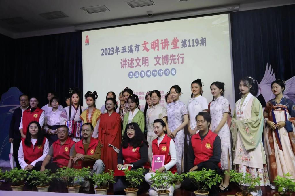 2023年10月31日,玉溪市“文明讲堂”总堂第119期在玉溪市博物馆举行,围绕“讲述玉溪文明故事”“传播中华文明故事”“传承志愿文明精神”三个篇章展开,墨韵汉服社参加了本次活动,并以《礼脉承先》节目展示和讲解了历朝汉服与礼仪。自黄帝时期而来,走过汉之古朴、唐之芳华、宋之风雅、明之流丽……作为一种文化符号,汉服文化中蕴藏了中华文明的均衡大度、和谐共生、多元融合。将中华优秀文化融入新时期文明建设,是时代的命题。墨韵汉服社主动参与到玉溪市博物馆、澄江一中等社会组织举办的文化活动中,以服饰传播中国的君子之道、社会之礼、文明之仪。此外,校园作为墨韵汉服社传承和发扬汉服和中华传统文化的首要平台也为墨韵汉服社参加各种活动,宣传汉服文化扩大影响力提供了很大的助力。墨韵汉服社收到了学校大部分学院以及社团的活动邀约,例如文学院的迎新晚会、院庆和大学生记者团承办的记者节活动等,这些活动带动了学校大半的学生了解到汉服社同时也向同学们宣传了汉服文化和传统礼仪,将汉服和传统文化更好地融入到了校园文化中。汉服社的指导老师林添获评玉溪市文明办优秀志愿者。2022年,墨韵汉服社拍摄的宣传片《与子同袍》在短视频平台推广,在共同的审美和价值追求中增强中华民族共同体意识。