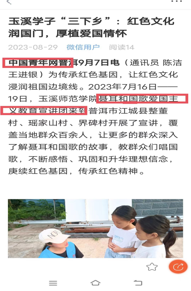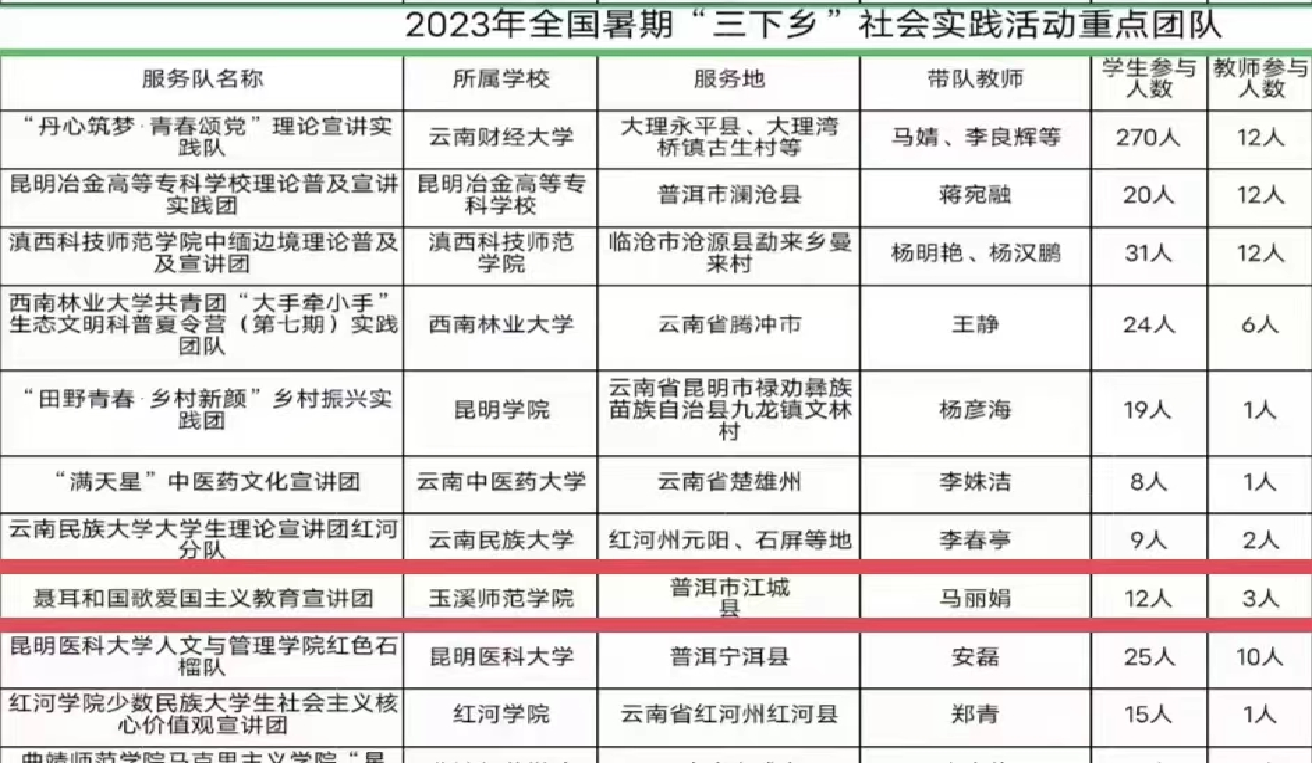 2021年到云南普洱墨江哈尼族自治县开展宣讲、访谈老党员、乡村产业调研、文艺汇演等;2022年到玉溪市江川区、红塔区等社区集中开展红色宣讲、调研等活动;2023年到普洱市江城县、西双版纳傣族自治州勐海县打洛镇勐景来村、腾冲市猴桥镇胆扎社区,通过升国旗、唱国歌、讲“聂耳与国歌的故事”、宣讲《国歌法》、探访非遗传统手工作坊、走访群众、问卷调查、捐赠图书等方式开展暑期社会实践活动。1个项目获全国重点团队立项,1个团队获云南省优秀社会实践团队。