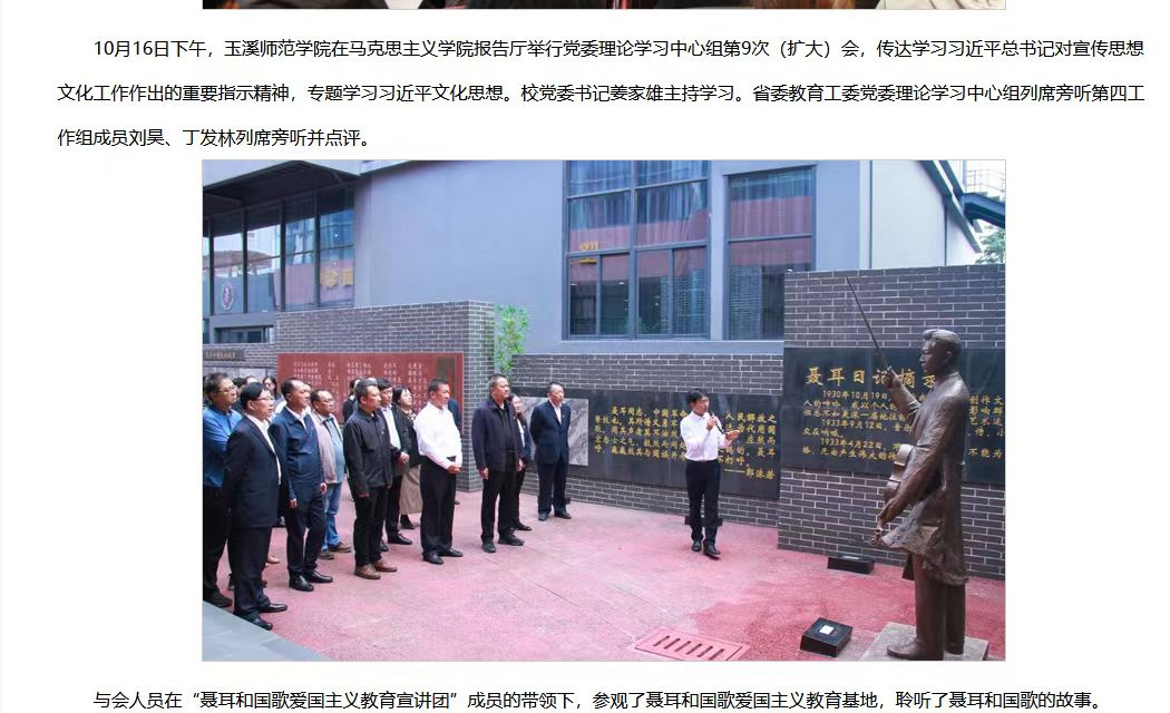 2020年1月,习近平总书记考察云南时指出:云南有光荣的革命传统,有很多感人肺腑的动人故事。比如聂耳和国歌的故事,要把这些故事作为“不忘初心、牢记使命”教育的生动教材。玉溪师范学院牢记习近平总书记嘱托,于2020年10月成立聂耳和国歌爱国主义教育宣讲团。