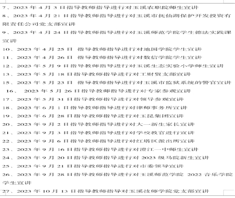 社团面向玉溪市政府、中小学、云南省部分高校,以及云南省工委教育党支部巡视组、中央广播央视总台、教育部语用司等开展宣讲活动,累计86场,共覆盖约2580人。社团活动受到学习强国、光明日报、人民日报、中青网、云南日报等主流媒体报道累计50余次。