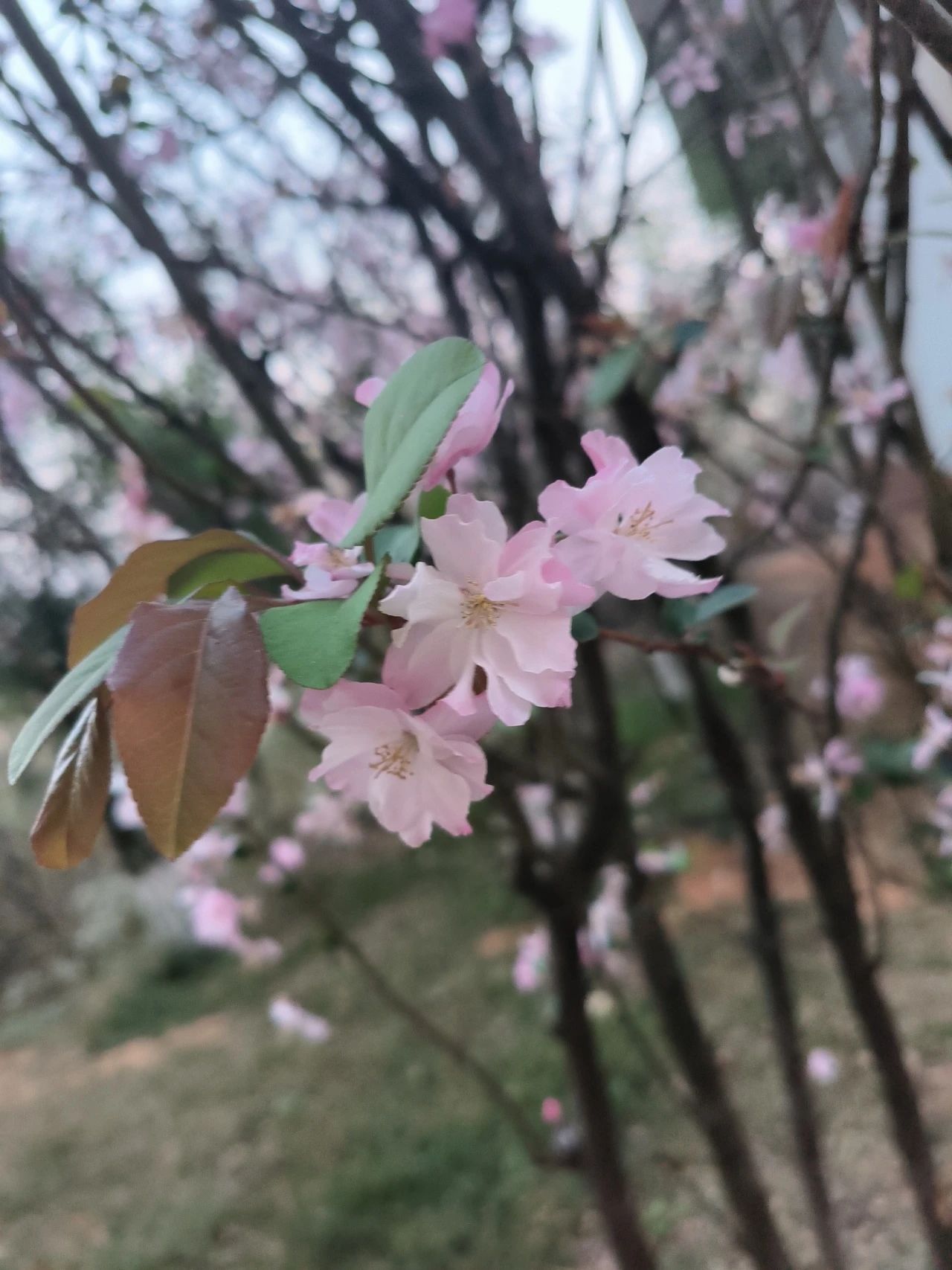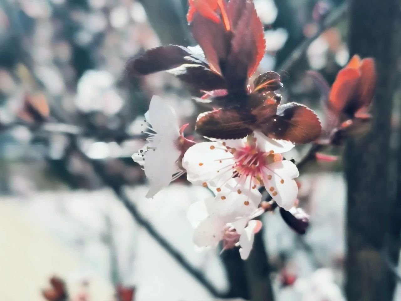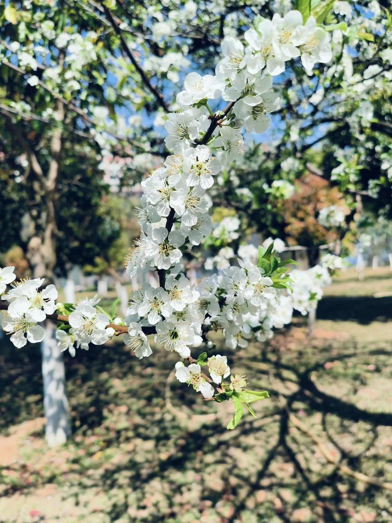 是春天的第一场花事只见千树万树开满了白里透出微红的花朵满树的白花随风撒下洁白的花瓣