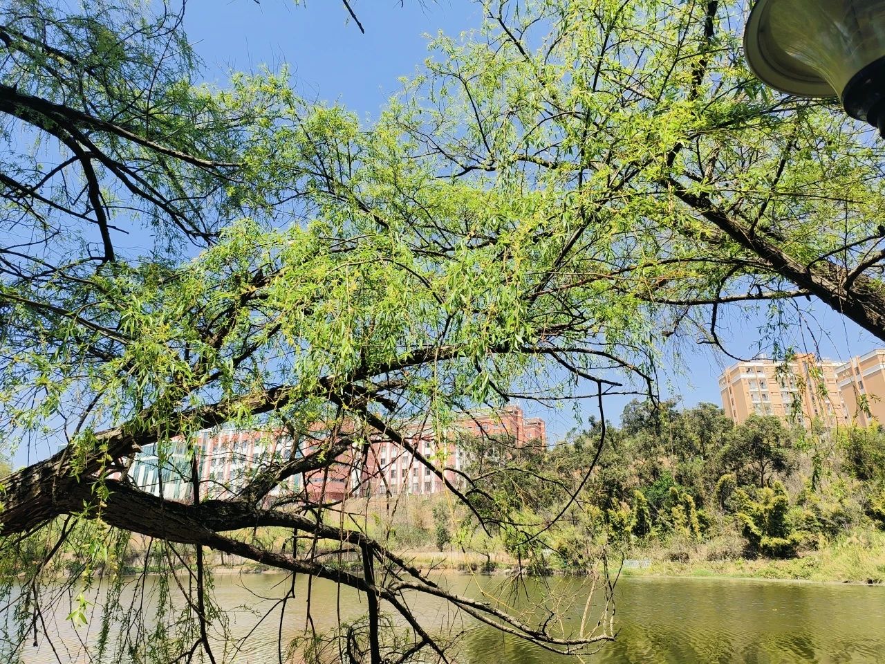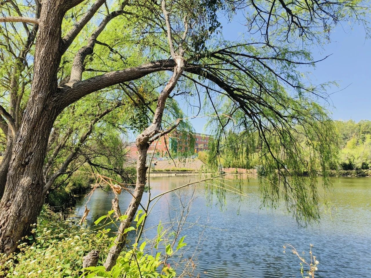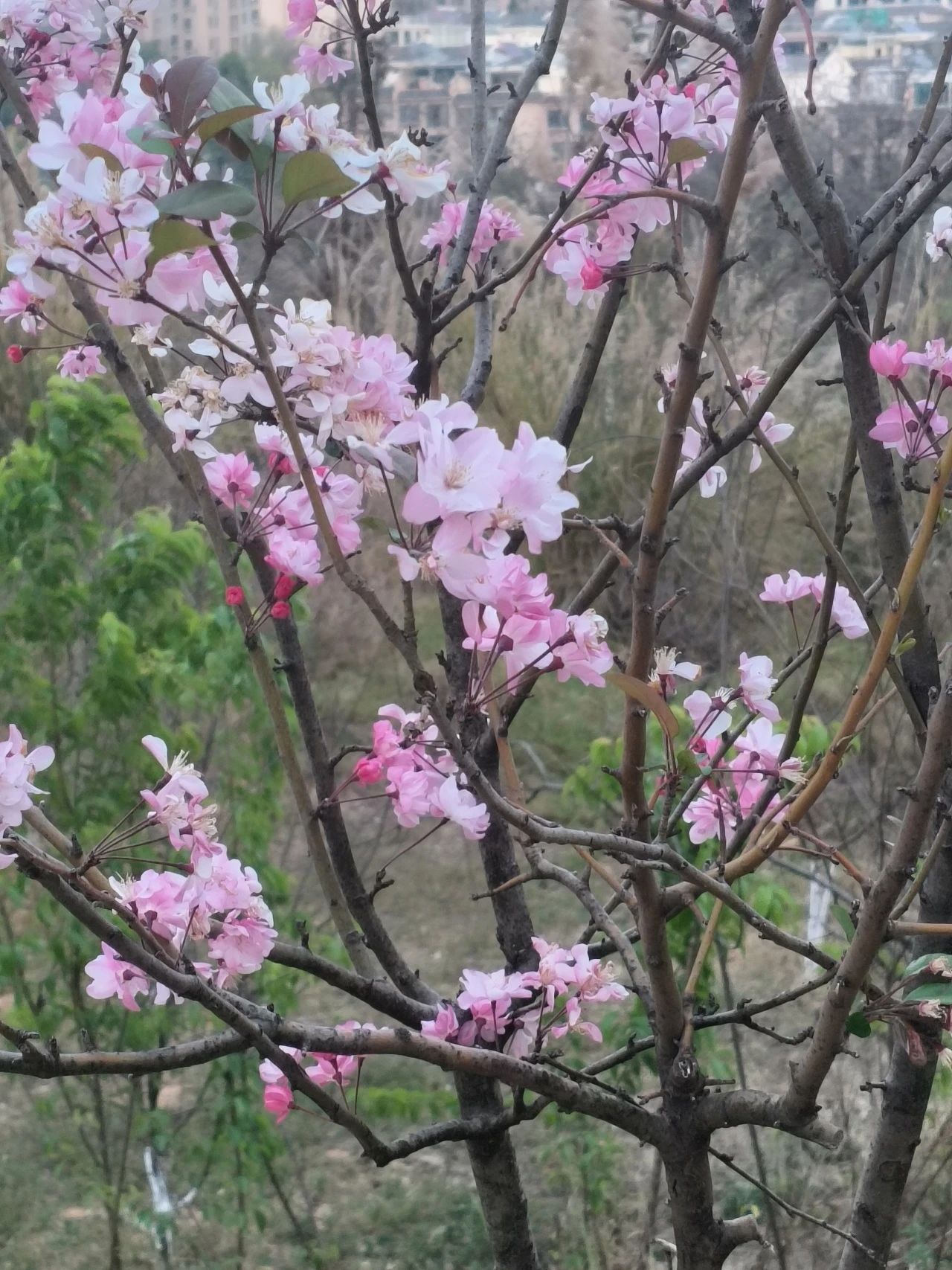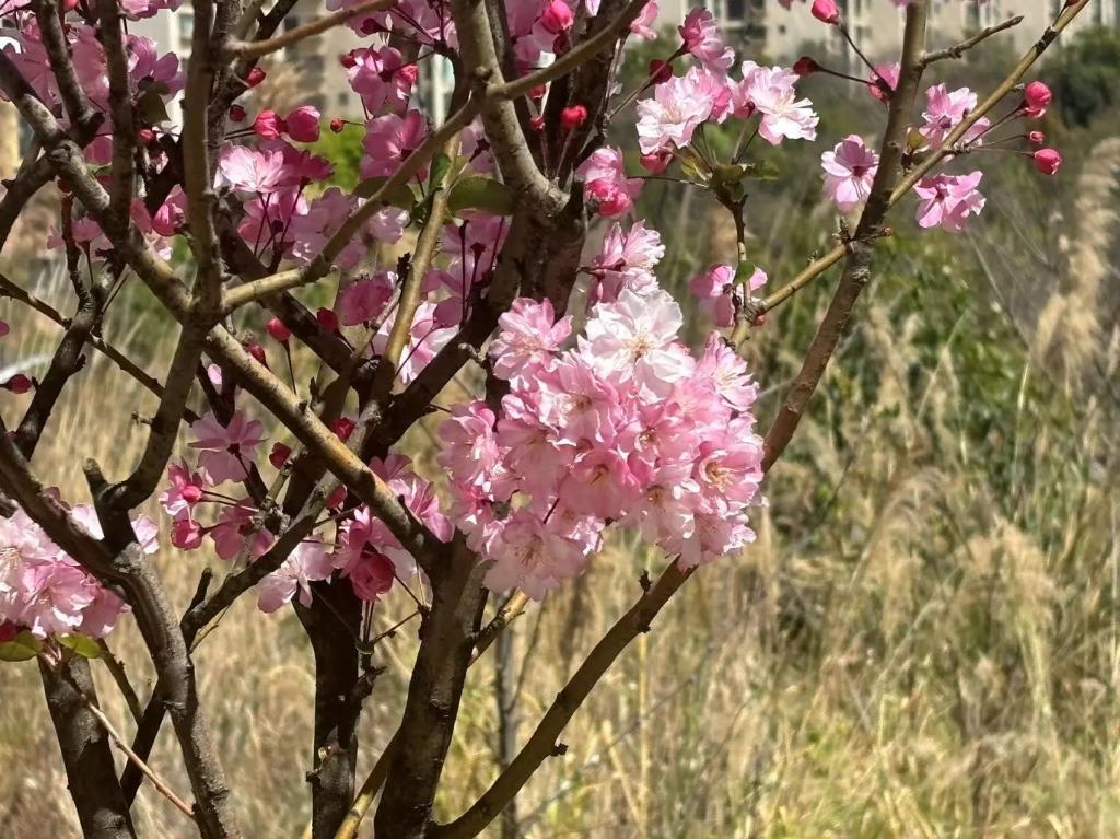 是春天的第一场花事只见千树万树开满了白里透出微红的花朵满树的白花随风撒下洁白的花瓣
