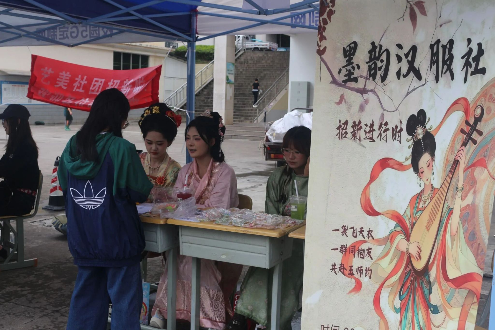 招新现场气氛热烈,各类社团百花齐放、尽展风采。“舞点伴”街舞社以动感舞姿点燃全场,墨韵汉服社华服加身、典雅端庄,犀光光影社用镜头捕捉校园瞬间,寻途户外社则通过专业装备展现探索精神……丰富多样的展示形式吸引了众多同学驻足咨询。大家穿行于各社团摊位之间,认真了解社团特色与活动安排,积极与社团成员交流互动。