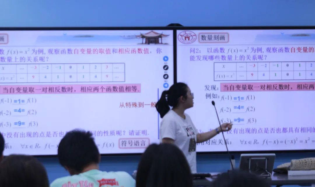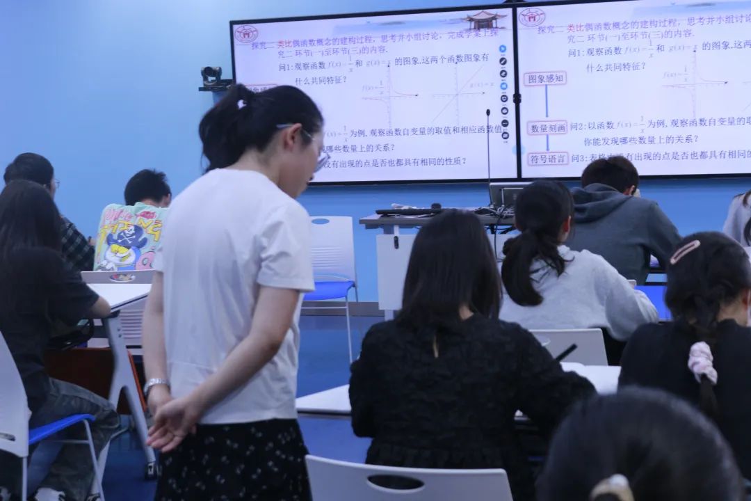 戴老师从身边事物的对称性联系到函数的对称性,引出重点:函数的奇偶性,加上提问回答和例题实操,通过深入浅出的方式,让同学们更好地掌握了函数的奇偶性这一知识点。在课程设计培训环节,戴老师分享了自身的教学经验,结合实际为师范生们提出了许多宝贵的意见并强调要“理解数学、理解学生、理解教学、理解技术”。对于同学们的问题和不懂的地方,戴老师也做出积极回应,帮助同学们解决,在这样融洽的课堂气氛中,最后的提问互动环节也结束了。