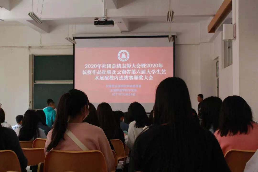 2021年3月26日,2020年学生社团总结表彰大会暨抗疫作品征集及云南省第六届大学生艺术展演校内选拔赛颁奖大会在14教103教室召开。校团委专职团干、各学生社团业务指导单位团委书记、各学生社团指导老师、各学院学生会分管社团主席团成员、各学生社团代表、校学生会社团部全体成员和相关获奖代表参与本次会议。