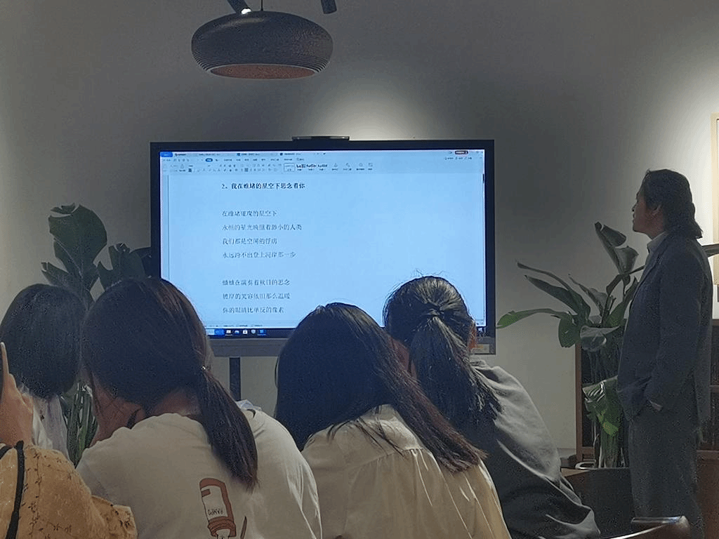 首先,赵老师与同学们分享了自己最喜欢的诗歌作品介绍了国外的和国内的著名诗人,幽默风趣的与同学们探讨了这些诗歌的表达意境与手法方式。接着,赵老师他选取了同学们投稿的一些诗歌来进行分析,给予同学们在诗歌创作方面的肯定及不足的地方。最后,赵老师还与同学们分享了自己所写的诗歌,谈论写诗歌的自我心得和一些技巧,让同学们有所启发。
