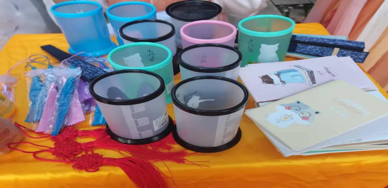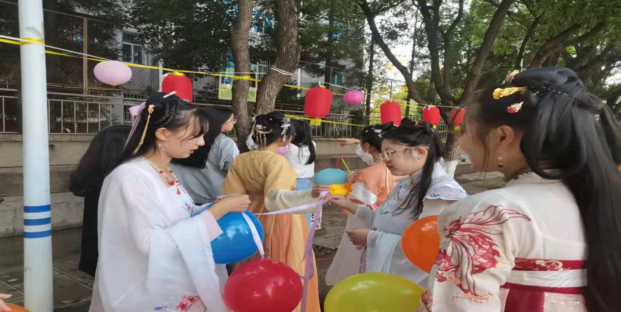 2021年9月21日下午五点整,身着汉服和便装的场地准备人员已经陆陆续续地到来了。她们拿着装饰用的彩色灯笼和各色彩带、气球及要猜的灯谜。下午五点半整,在一片热火朝天的气氛中,所有人开始在田径场周围的树上挂彩带,灯笼和气球。一步一步地按照步骤进行,按部就班,有条不紊。伴随着装饰活动告于段落,兑奖处的礼品也陆续地摆上了。笔筒、扇子、吊坠和本子吸引了路人的目光,使得他们纷纷靠近来询问活动开始的时间。