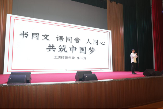 张云涛的作品《书同文语同音人同心》立足云南省情,结合我校语言工作实际,阐述了对习近平总书记关于语言文字工作的重要论述。以高质量推广国家通用语言文字,助力乡村振兴和民族团结,是语言文字工作的基本思路。