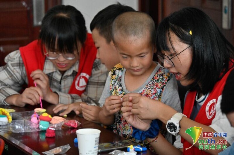 图为下午的超轻粘土课上,小朋友和候鸟成员一起探究粘土模型的过程。小朋友们对超轻黏土很感兴趣,学得也很快,现场气氛十分和谐融洽。中国青年网通讯员 黄铭崧 摄