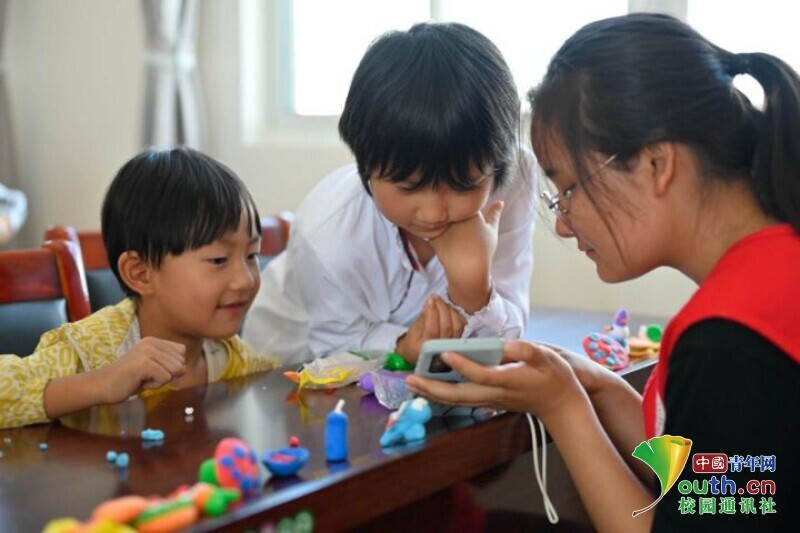 图为候鸟团队成员借住手机媒介让小朋友们的构思之花绽放的精彩瞬间,借助手机可以直观的让小朋友们快速了解所要制作东西的形象。中国青年网通讯员 黄铭崧 摄
