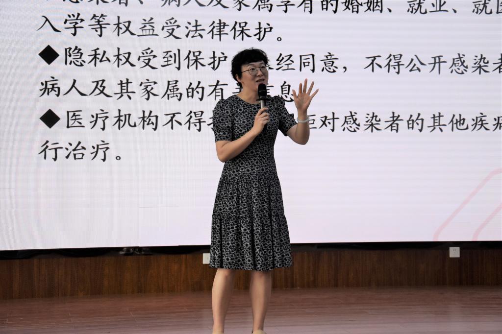 讲座中,吴医师深入浅出地讲解了艾滋病的发展史、艾滋病病毒的特征、艾滋病的传播途径及艾滋病的预防等相关知识,用生动的事例、大量的数据以及令人触目惊心的图片让学生们深刻地认识到艾滋病的危害。紧接着,吴医生又从科学的角度向同学们详细讲解了艾滋病病毒侵入人体的原理,希望大家改变以往“谈艾色变”的观念。同时吴医生指出目前“鸡尾酒疗法”是世界公认的治疗艾滋病最有效的方法,如果怀疑自己可能患有艾滋病应当主动咨询检测、到各医疗机构检查。最后,吴医生呼吁同学们对艾滋病患者多一份包容,少一份歧视,尊重病人、尊重生命,给予每个生命关爱。