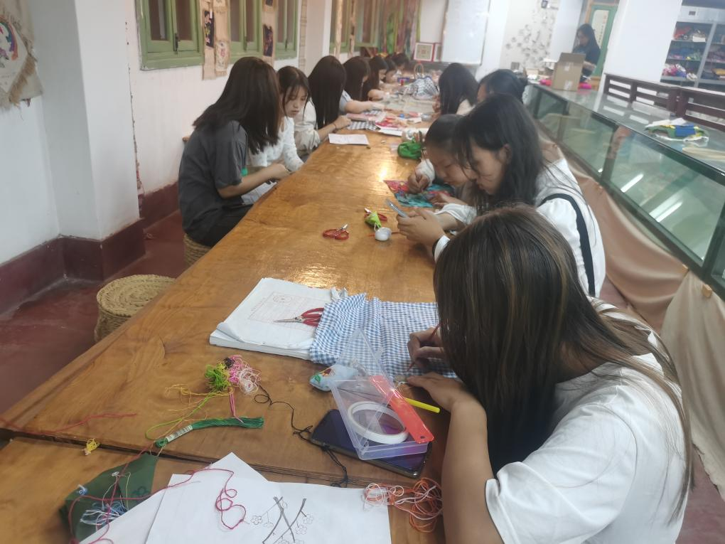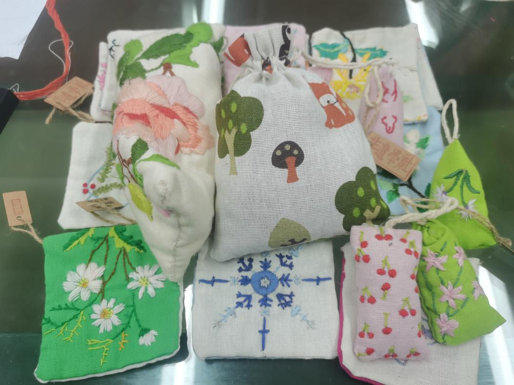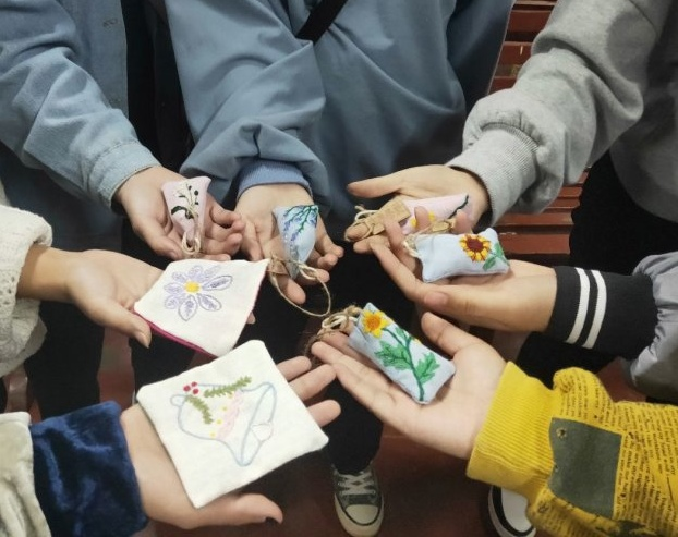 社团为同学们准备了布料、彩绳、针线、挂饰配件等材料。老师指导同学们在香囊上绣出了各自喜欢的图案。当成果展现出来时,大家欣喜之情溢于言表,小小的香囊看起来美丽,做起来却不简单。在制作过程中,同学们一边缝香囊,一边讨论交流缝制心得,一片欢声笑语。不知不觉中,一个个形态各异、色彩斑斓的香囊堆满了桌子,同学们收获满满。