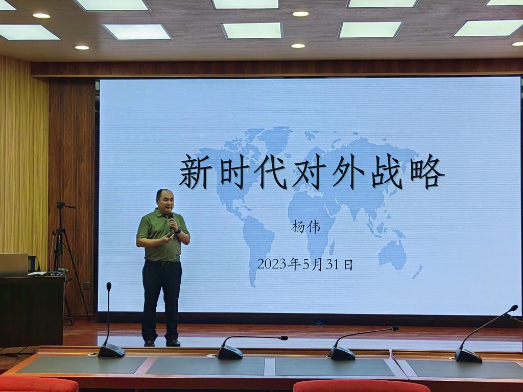 杨伟副校长介绍了新时代外交的主题,即推动构建人类命运共同体。他强调推动构建人类命运共同体不仅是党的二十大提出的重点目标,更是全球发展和时代潮流的必然选择。他围绕坚持和平发展道路的重要性、推动构建新型国际/大国关系、新时代对外战略具体推进等问题,为同学们作了进一步的解读,指出和平发展是当今世界面临的重要问题之一,只有坚定不移地走和平发展道路,才能确保人类社会的可持续发展。