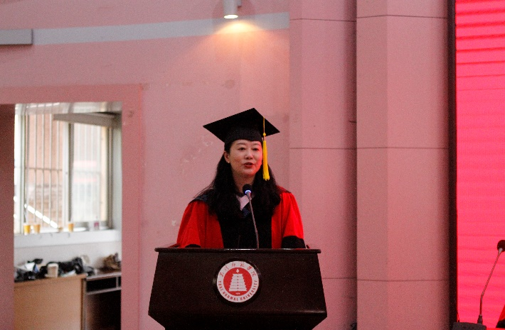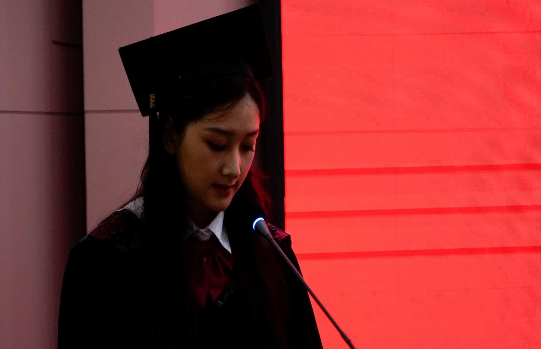 毕业生代表陈梦婷代表全体毕业生发言,回忆了大学的美好生活,表示将心怀感激,迎接未来的挑战。