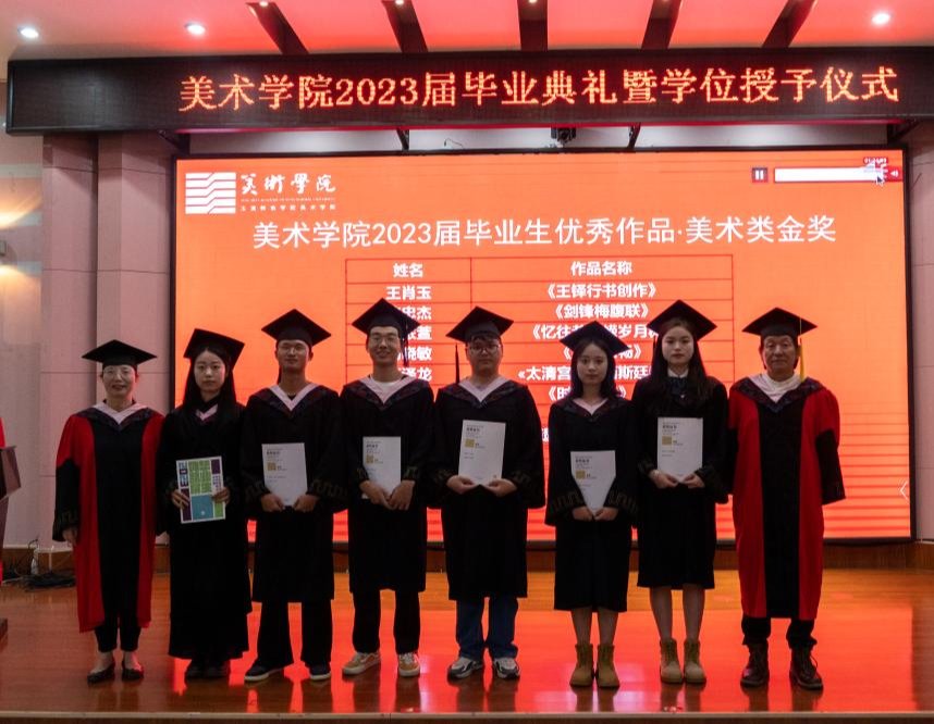 美术学院党委书记杨丽珍、郭巍教授为2023届优秀毕业作品(美术学类)金奖获得者颁奖并合影留念