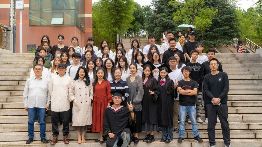 美术学院禾子佳老师、梁木老师、熊斌老师为2023届优秀毕业作品铜奖(美术类)获得者颁奖并合影留念