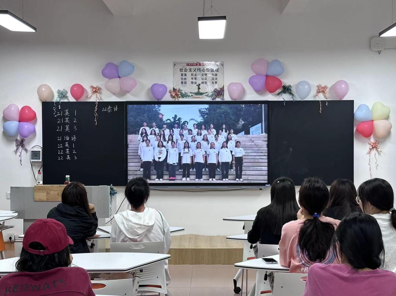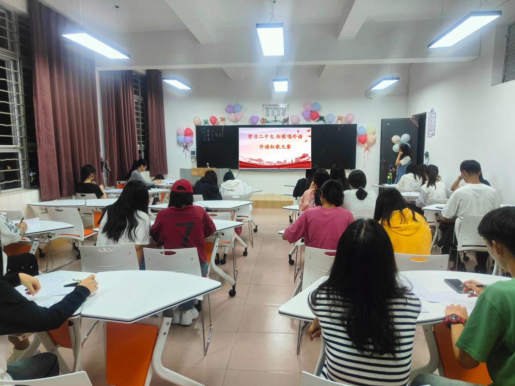 2023年9月23日20:00,外国语学院于二教104组织开展了以“学习党的二十大,用外语唱红歌”为主题的红歌比赛。外国语学院21级,22级共计9个班均参加了此次比赛,外国语学院组织了专门的评审小组进行打分。