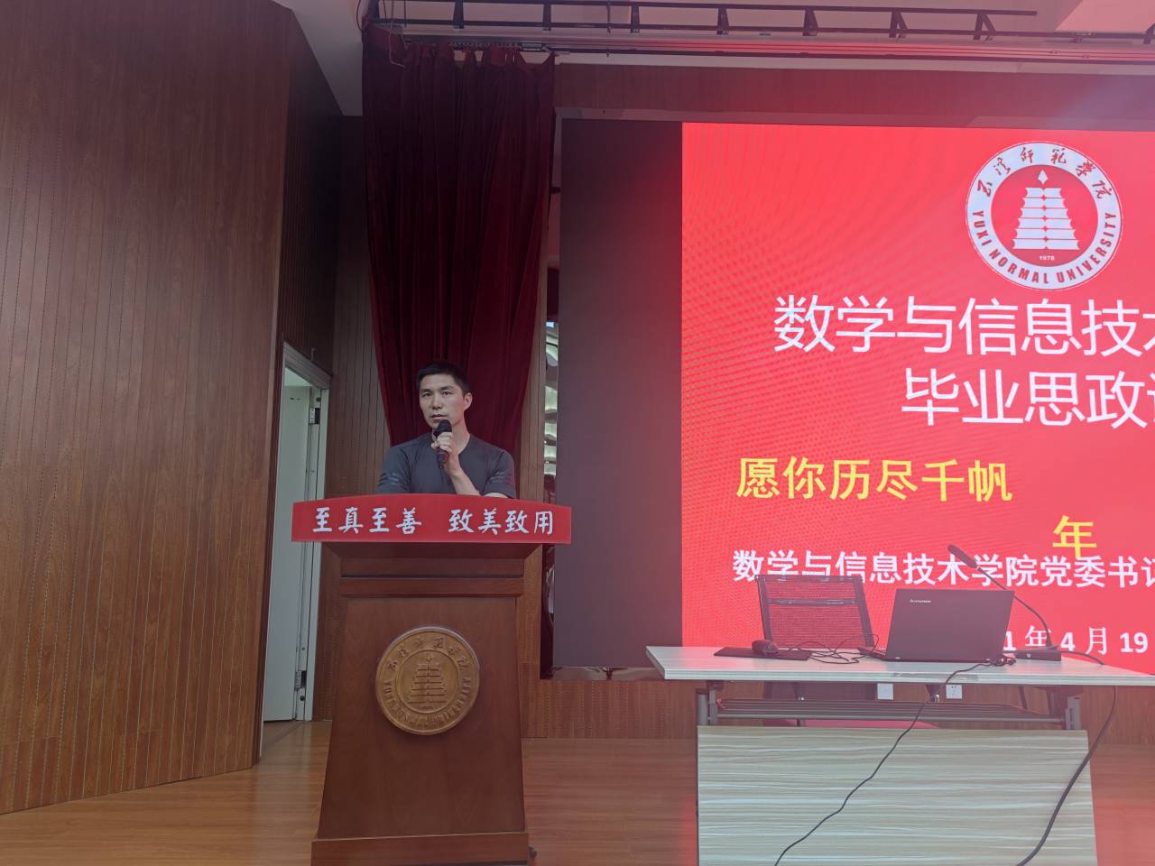 为切实加强毕业生理想信念教育,落实立德树人根本任务,强化以学生为中心的教育理念,2021年4月19日下午,数学与信息技术学院党委书记张敏在大学生活动中心讲授毕业思政课。通过离校前最后一堂思政课堂引导学生立鸿鹄志、怀报国心、做奋斗者、成时代人。数信学院 2017 级全体毕业生聆听了本次思政课。