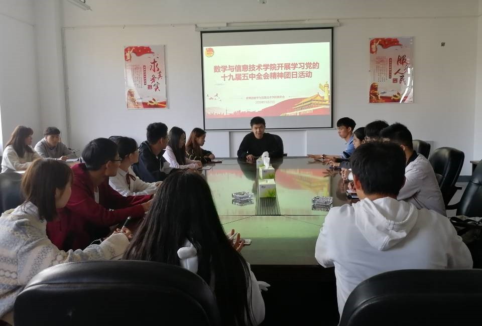 为了让广大师生能准确把握十九届五中全会的精神实质和重大部署,自觉用全会精神武装头脑、指导实践、推动学习和工作。数学与信息技术学院于2020年11月23日星期一中午12:30在实训大楼A-301开展“学习十九届五中全会精神”主题团日活动。本次会议由数信学院团委副书记吕加贤同学主持召开。18-20级各班团支书,数信学院团委学生会干部参与此次活动。