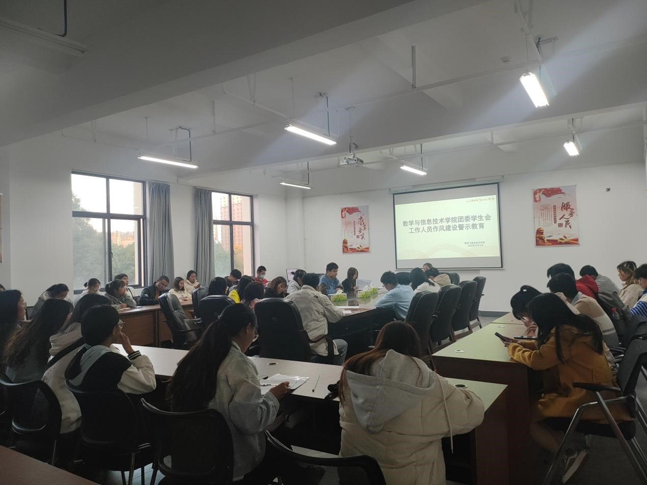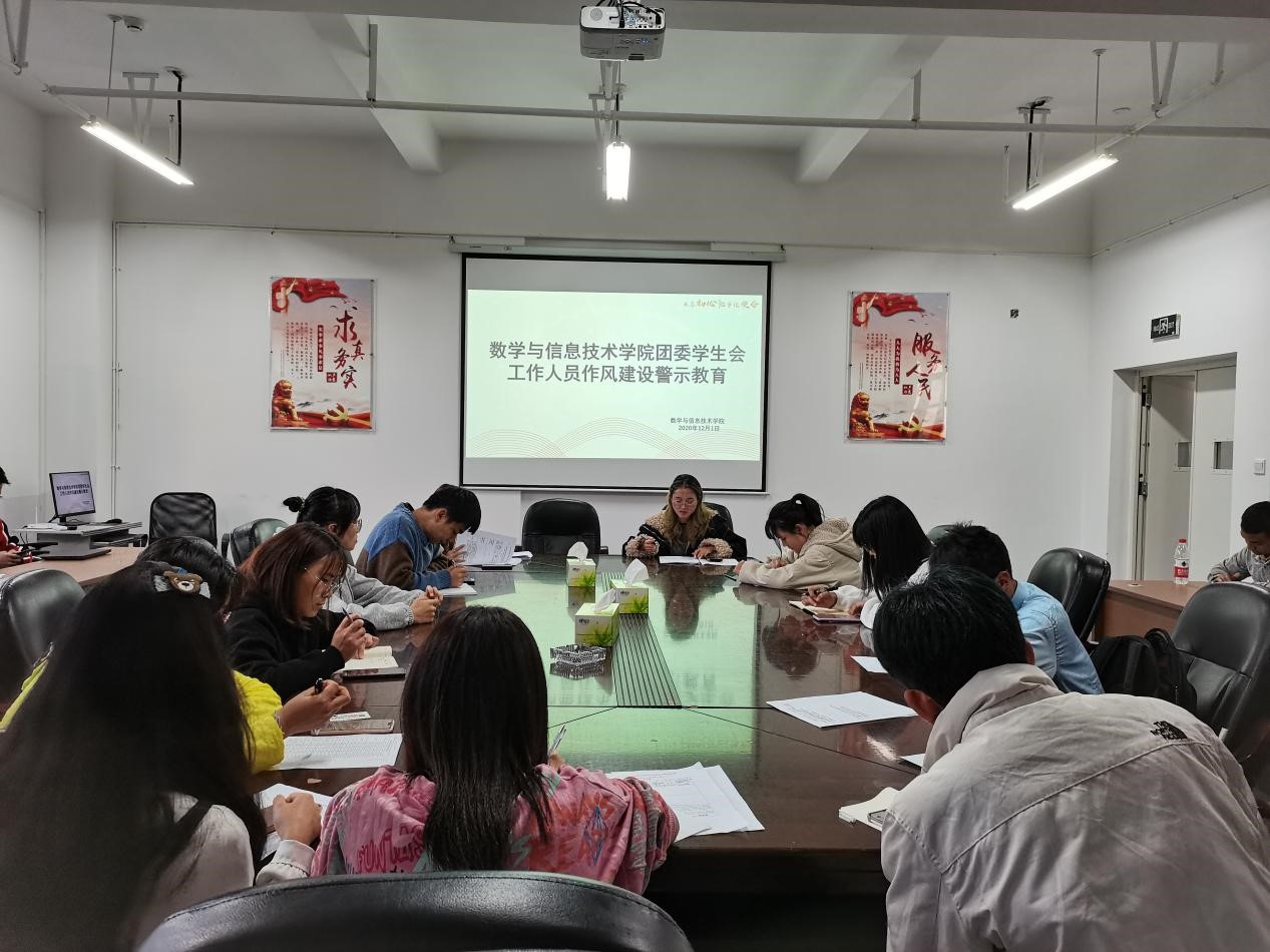 为深入学习贯彻习近平总书记致全国青联十三届全委会和全国学联二十七大的贺信精神,持续深化学联学生会组织改革,全面加强对学联学生会工作人员的管理,全面提高学生会组织的大局贡献度、同学满意度、社会美誉度,塑造清新阳光的组织形象。数学与信息技术学院于2020年12月1日星期二下午18:00在实训大楼301教室举行关于开展学联学生会工作人员作风建设警示教育的活动。此次活动由数信学院团委学生会主席侯正芸主持召开,18-20级各班班长以及团委学生会干部积极参与。