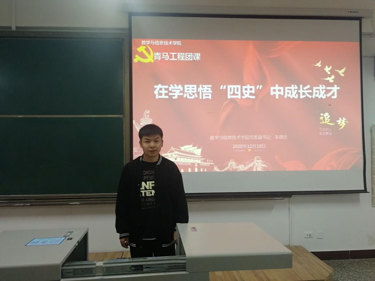 2020 年 12 ⽉ 18 ⽇星期五下午 19:00,数学与信息技术学院“青年马克思主义者培养工程”活动在 13 教 111 教室举行。数信学院党委副书记李德良老师、团委学生会干部以及各班干部,共计 100 余人参加此次活动。