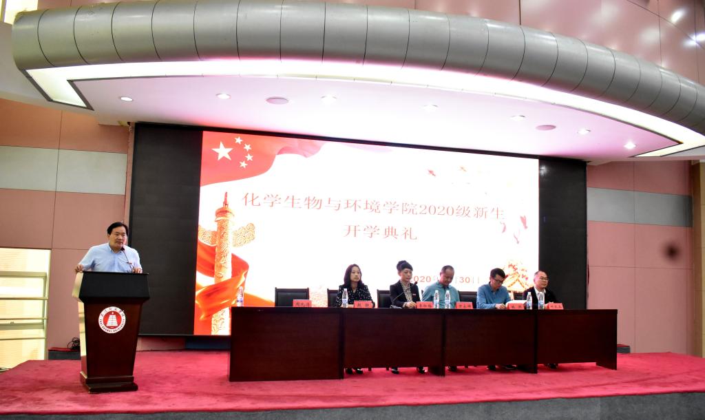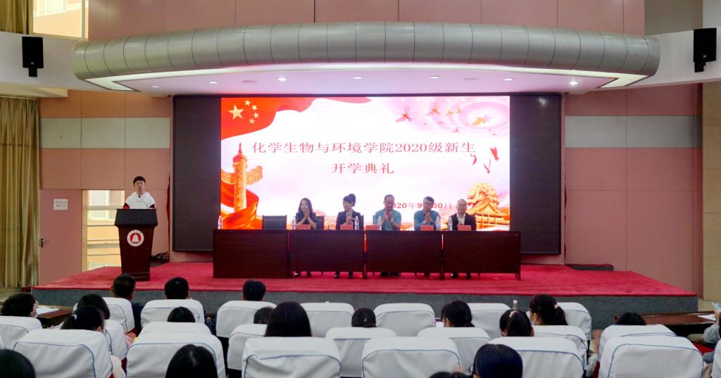 新学期,新姿态,新目标。为迎接2020级新生的到来,化学生物与环境学院于2020年9月30日上午9:00在多元学术报告厅隆重举行了2020级新生开学典礼。本次活动由学院团委书记、总辅导员李德海老师主持,学院院长李红梅老师、党委书记万永坤老师、党委副书记赵静老师等领导受邀参加。