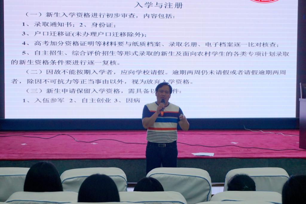 会议伊始,李德海老师从学籍学历管理方面向同学们详细介绍了学校的规章制度以及转专业的相关事宜。随后,老师着重给新生讲解了网络选课的流程,以及注意事项,并安排了学长学姐给新生出谋划策,为他们的选课提供了便利。