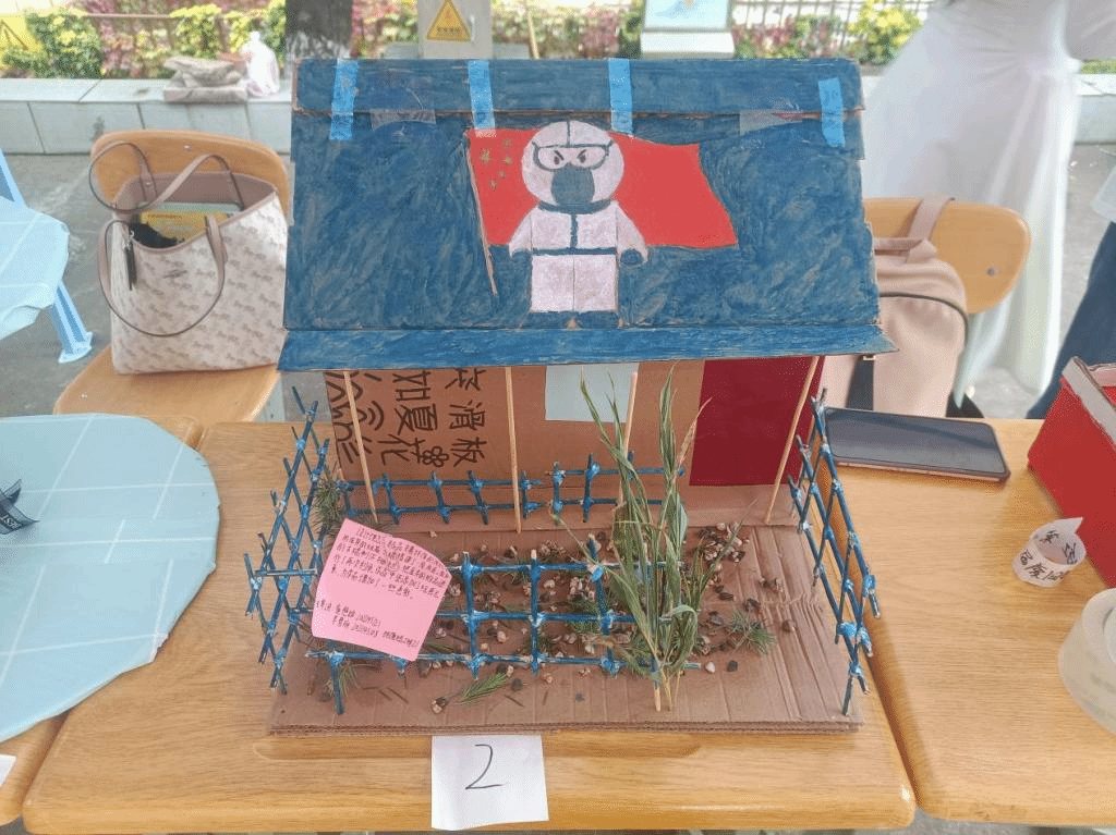 在参加作品中,每位同学都有自己独特的想法,大家都利用不同的方式让每一个废旧物品焕发新的生机。经过粘连,上色等步骤,利用纸板制造房屋、塑料瓶制造假花、口罩制作香袋……提升动手能力与创造性思维的同时,也向我们反应了要在日常生活中发现美,创造美的观念:一个不起眼的物品,也能有它绽放光彩的时刻。