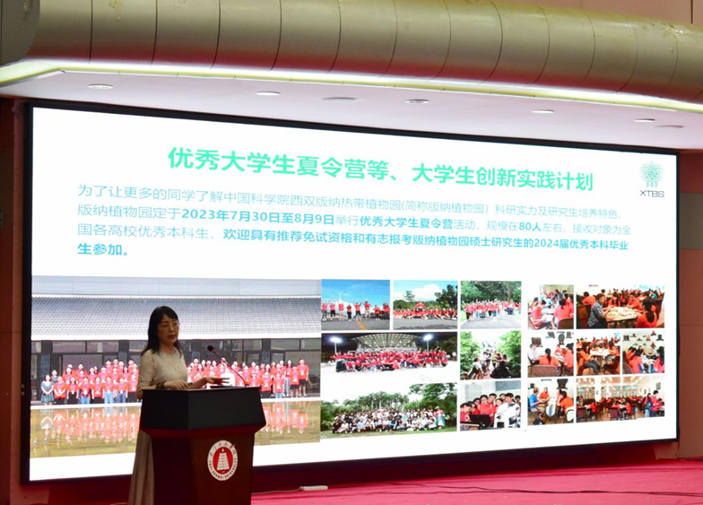 周双云处长就中国科学院西双版纳热带植物园2024年的硕士研究生招生进行宣讲,详细介绍了版纳植物园的科研条件、师资力量、办学特色、招生情况、研究生待遇、学习环境和暑期大学生夏令营活动。并欢迎我院学生积极报考中国科学院西双版纳热带植物园。